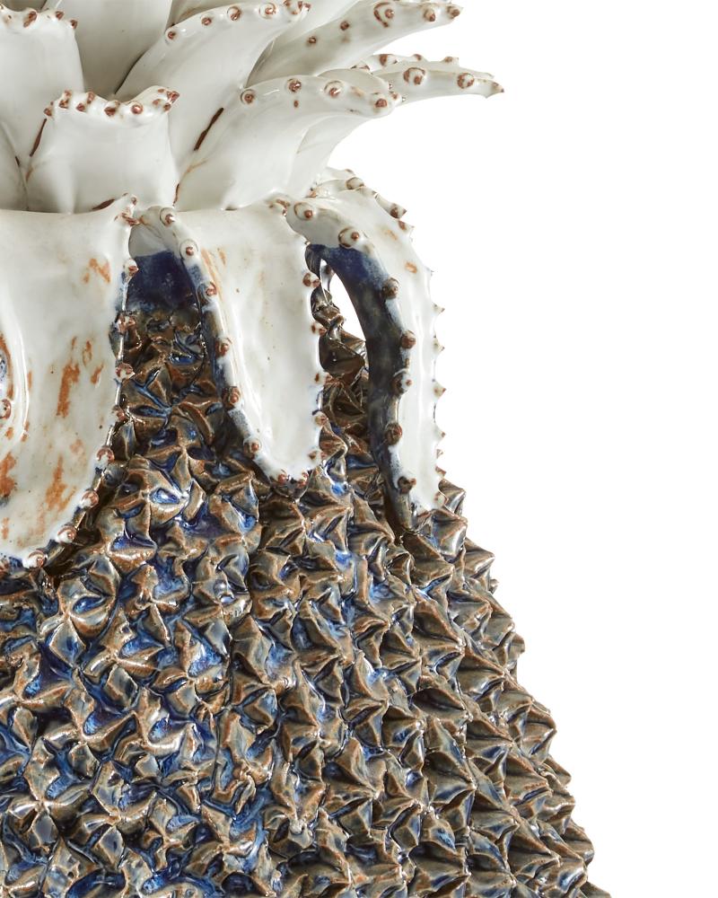 The Waikiki Large Blue Pineapple decorative accessory is handmade of stoneware by women artisans living at the border of Burma and Thailand. From the Hawaiian shores to 1940s Miami, the pineapple has long been a symbol of hospitality. Place this powdery blue and white ceramic sculpture prominently in a room to make a bold statement.