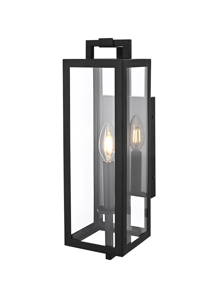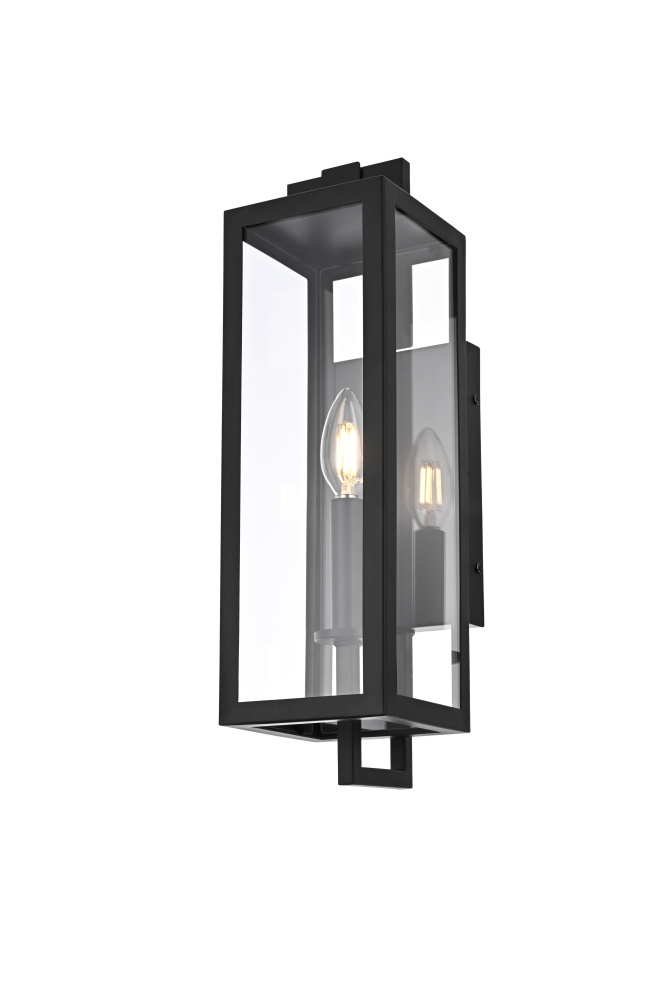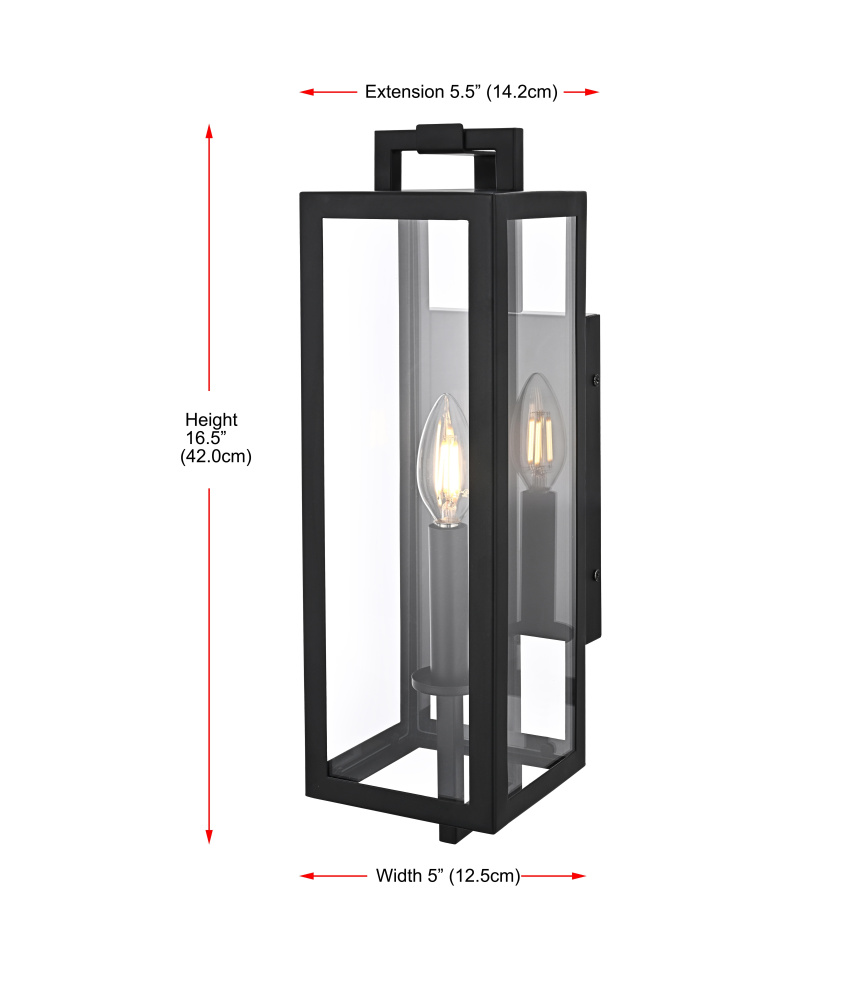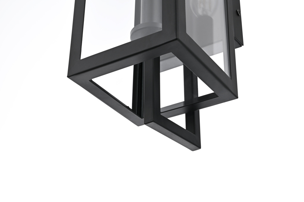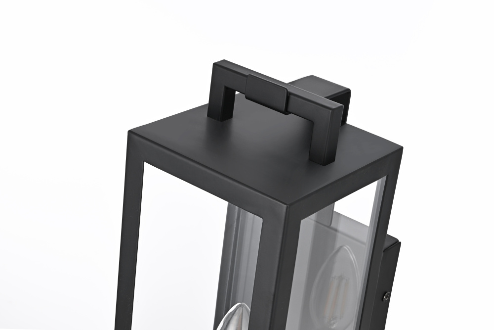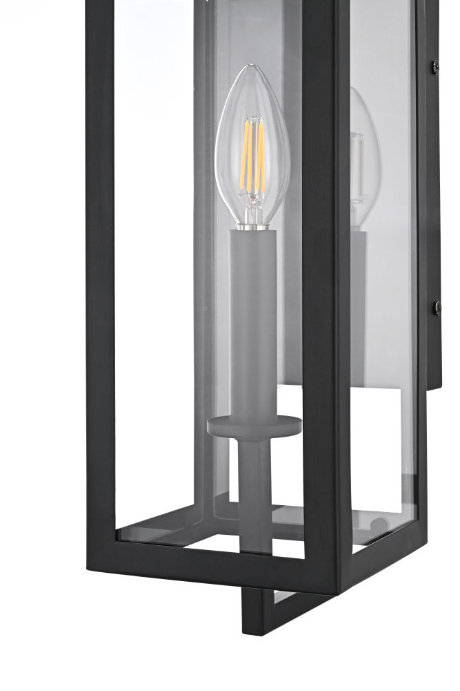 Introduce a striking architectural element to any outdoor space with a tall, rectangular wall sconce that merges clean lines with classic lantern influences. A sleek matte black iron frame surrounds crystal-clear glass panels, allowing light to radiate unobstructed for a bright and welcoming glow. The candle-style E12 socket (bulb not included) adds a touch of traditional elegance, while the structured top handle detail elevates the overall design. Designed with an open bottom for easy bulb replacement and downward illumination, this wet-rated outdoor fixture is built to withstand the elements. Whether paired with a warm Edison bulb for vintage charm or a bright LED for crisp modern lighting, this outdoor sconce enhances porches, entryways, and garages with its bold, refined presence.