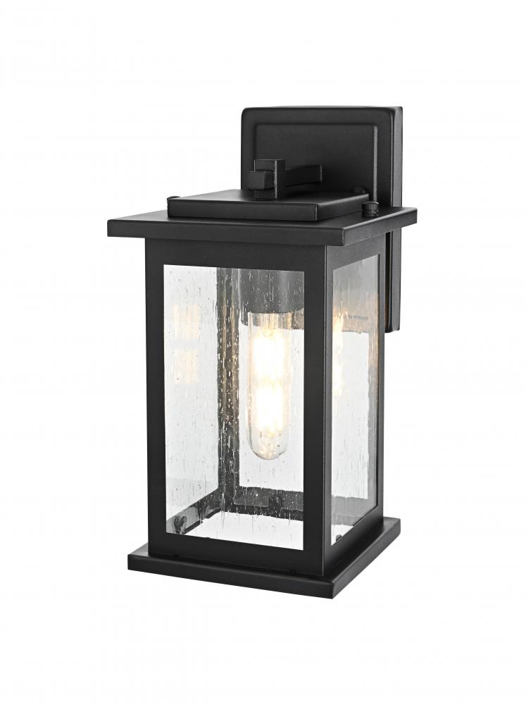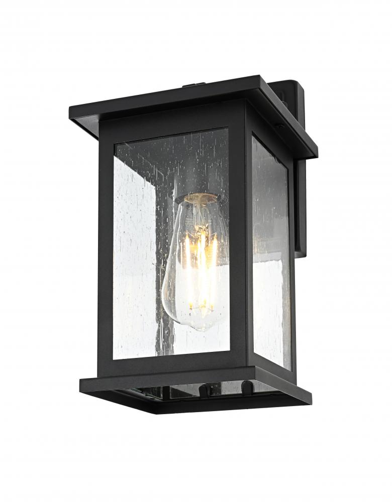 Enhance your outdoor space with this stunning wall sconce, merging a sleek, modern design with timeless craftsmanship. Crafted from durable iron and combined with clear glass panels, this outdoor light exudes an inviting warmth while providing functional illumination. Its crisp rectangular silhouette and clean lines blend beautifully with a variety of architectural styles, adding sophistication to any porch, patio, or entryway. The sconce's E26 socket makes it compatible with a range of bulb types, allowing for customizable ambiance. The textured seeded glass adds depth and visual interest, effortlessly scattering light to create a soft glow. Built to withstand the elements, this sconce not only provides aesthetic appeal but also offers reliable outdoor illumination that you can count on for years to come.