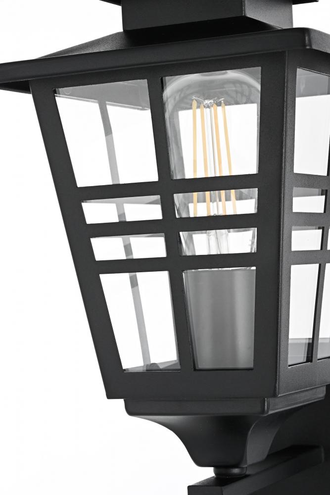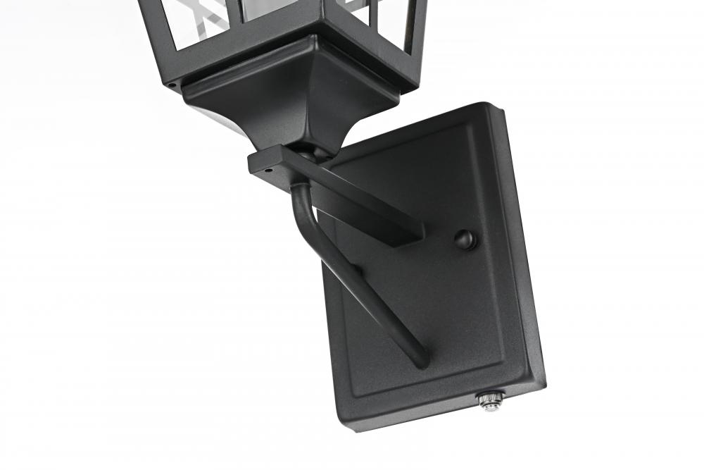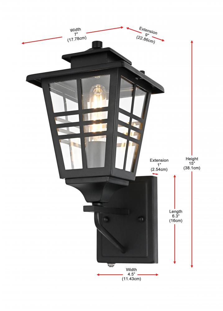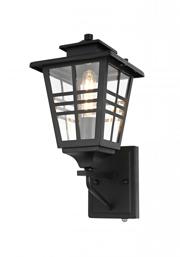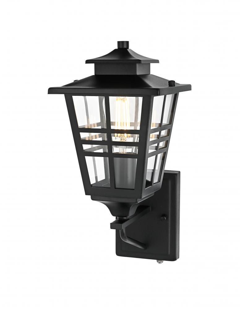 Add a welcoming glow to your outdoor spaces with this timeless lantern-style wall sconce. Inspired by traditional craftsman designs, this sconce features a durable iron frame paired with clear glass panels to provide excellent illumination. The matte black finish complements any exterior decor, adding a stylish yet functional touch to your entryway, patio, or garage. with a built-in dusk to dawn sensor, this fixture makes outdoor lighting effortless, automatically turning on at night and off during the day. The grid detailing on the clear glass panels enhances the overall aesthetic while delivering a bright and comforting glow. Built to withstand outdoor elements, this wall sconce is both practical and visually appealing, perfect for illuminating your home's exterior with style and efficiency.