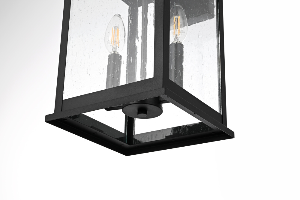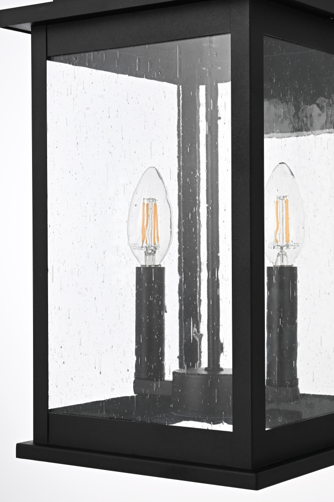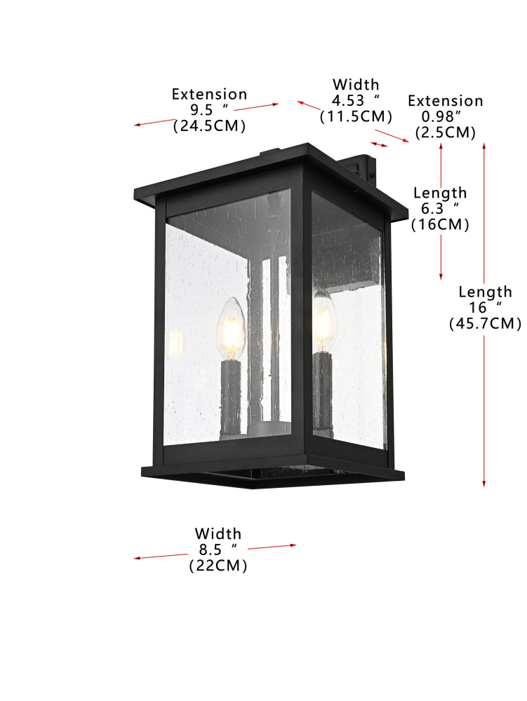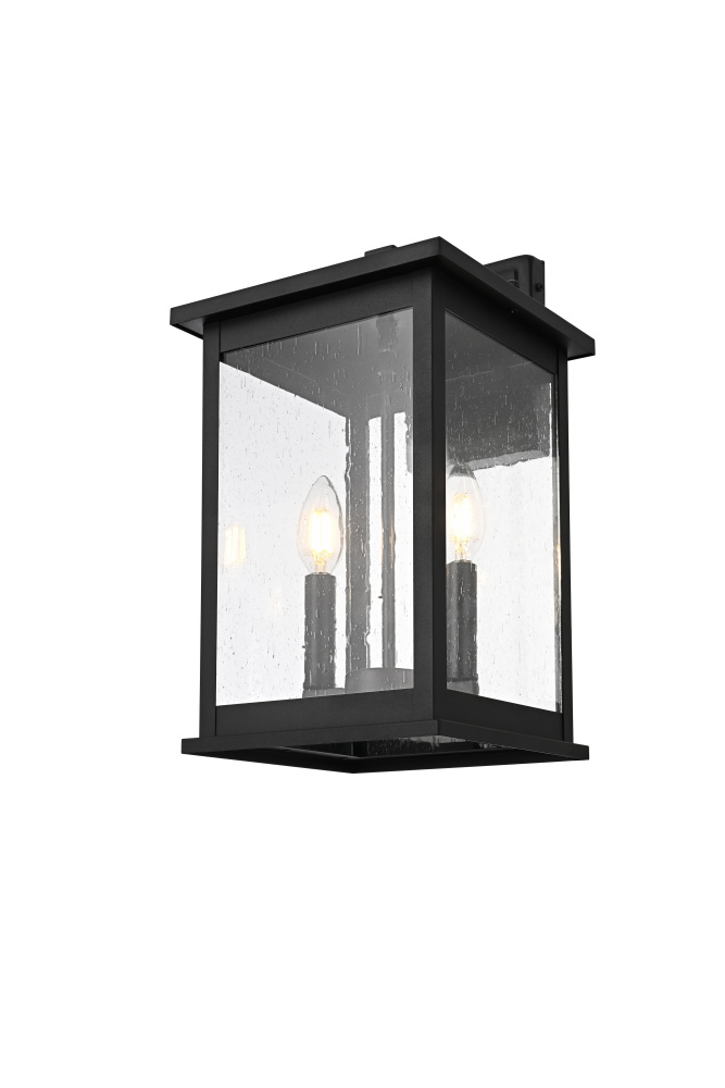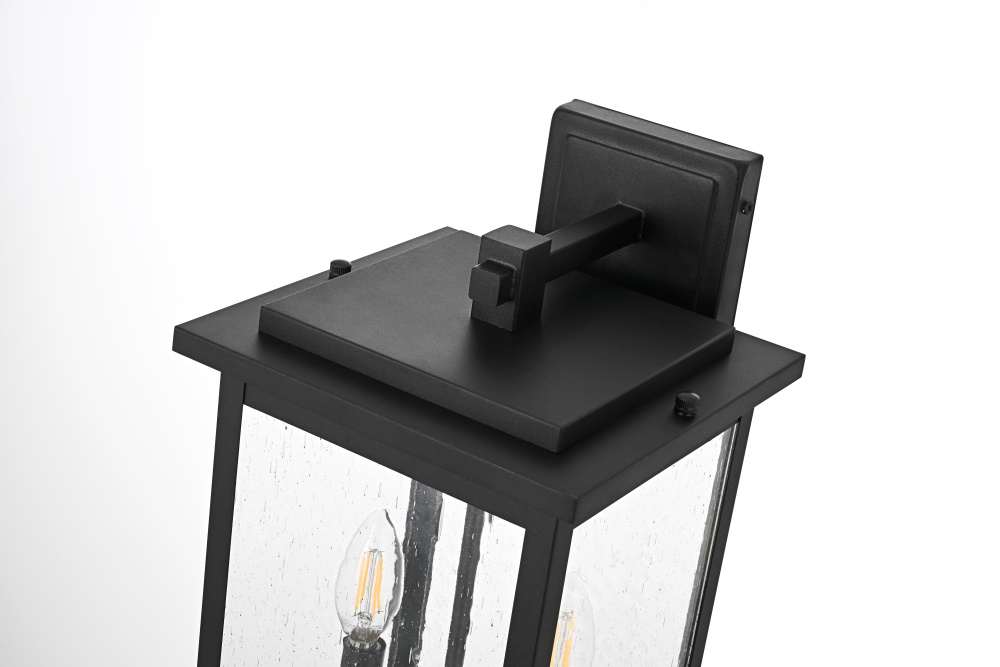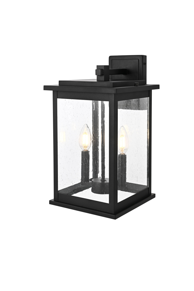 Enhance your outdoor space with this stunning wall sconce, merging a sleek, modern design with timeless craftsmanship. Crafted from durable iron and combined with clear glass panels, this outdoor light exudes an inviting warmth while providing functional illumination. Its crisp rectangular silhouette and clean lines blend beautifully with a variety of architectural styles, adding sophistication to any porch, patio, or entryway. The sconce's two E12 sockets makes it compatible with a range of bulb types, allowing for customizable ambiance. The textured seeded glass adds depth and visual interest, effortlessly scattering light to create a soft glow. Built to withstand the elements, this sconce not only provides aesthetic appeal but also offers reliable outdoor illumination that you can count on for years to come.