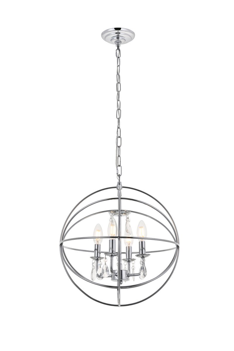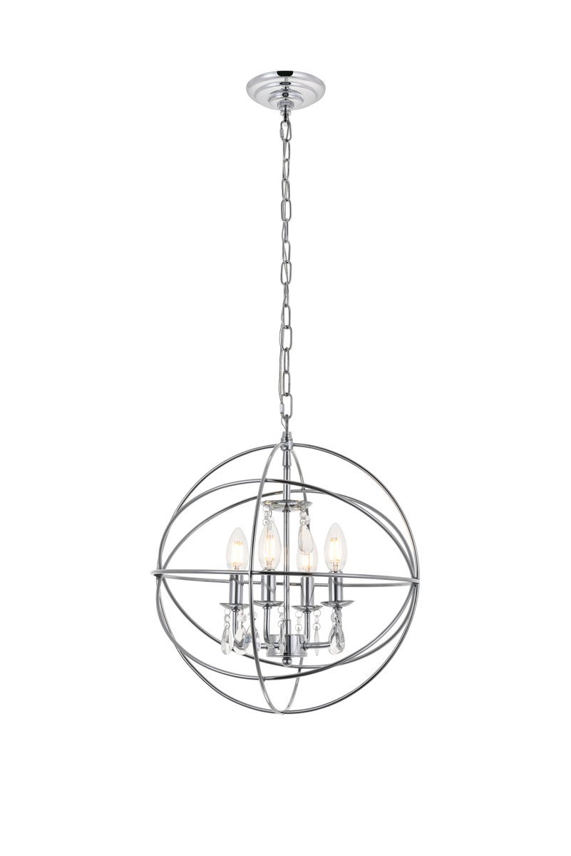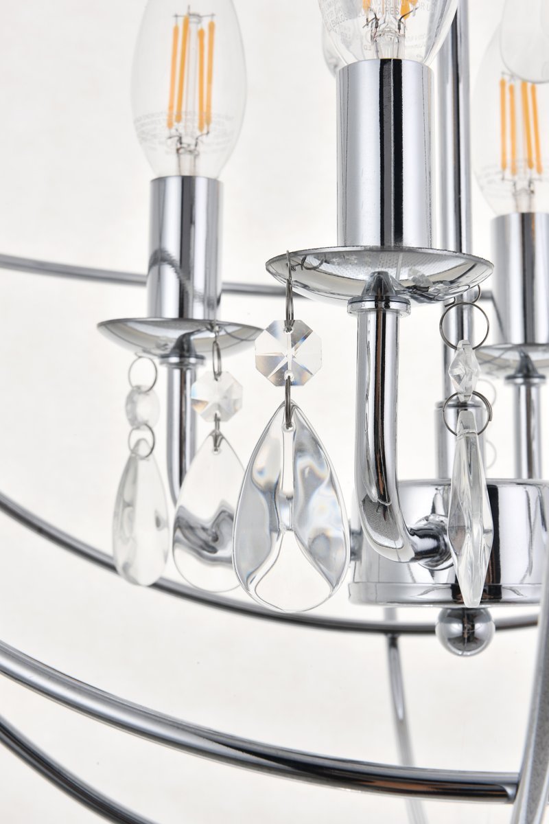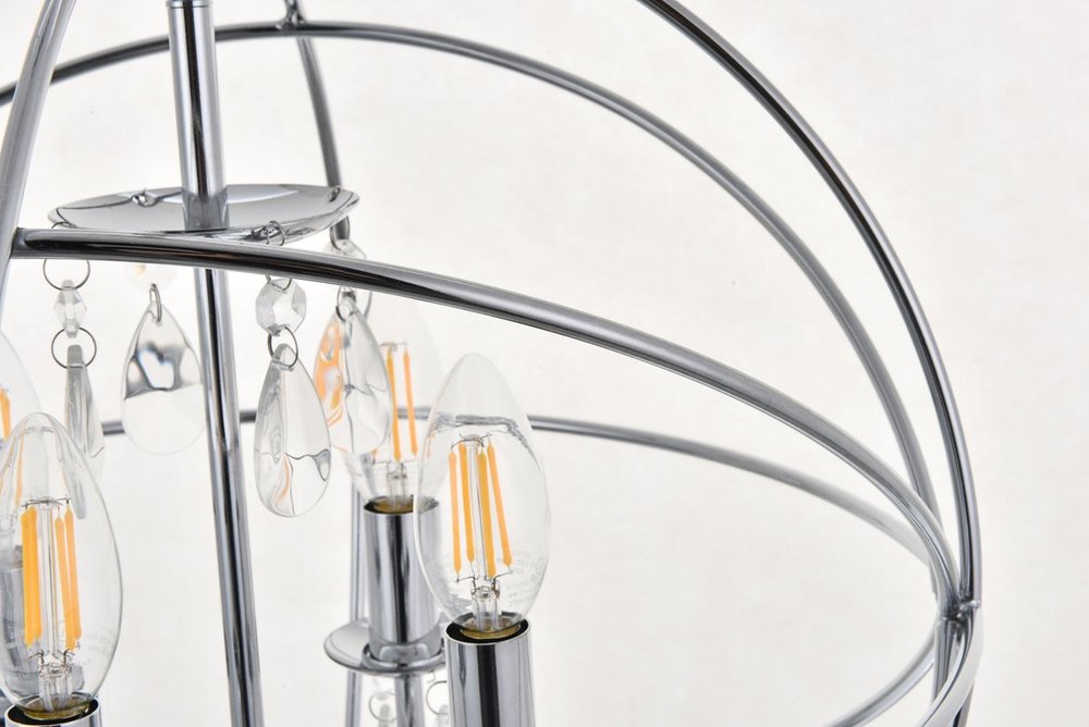 Chrome finish open gyroscopic frame with suspended crystals hanging from the bobeche, offering a stylish old world charm