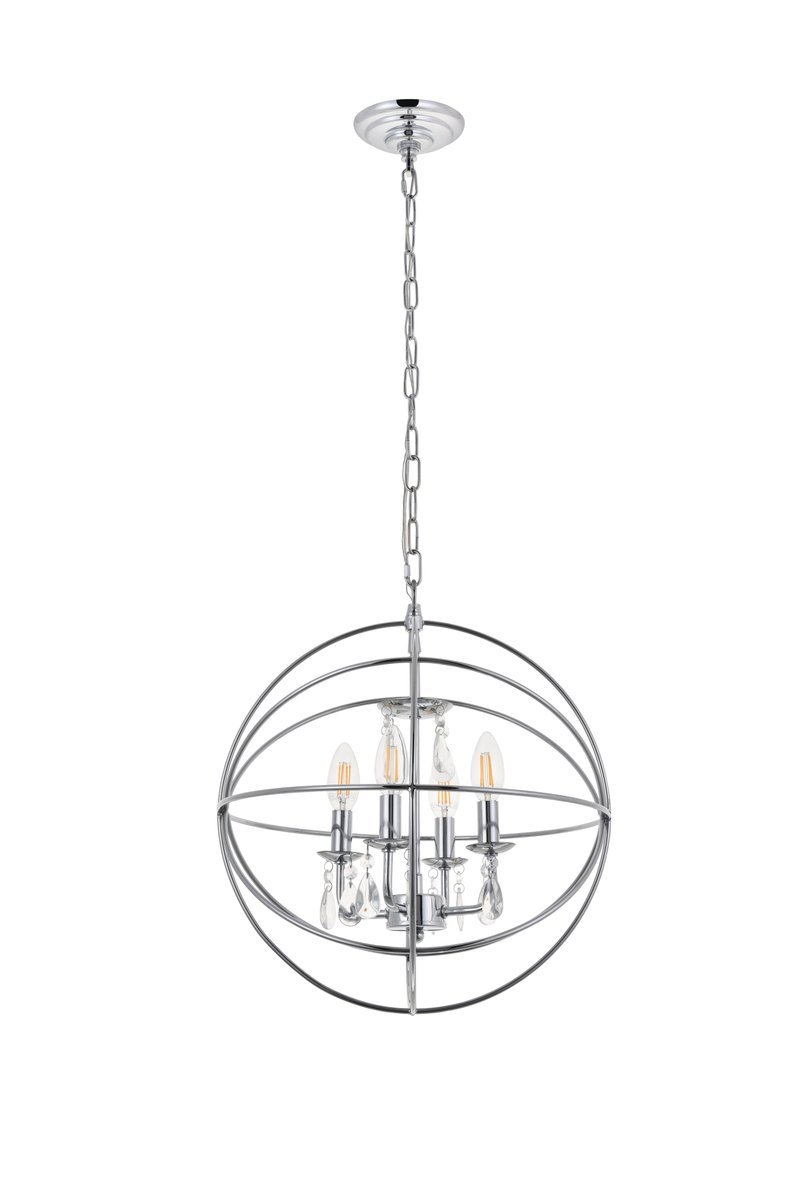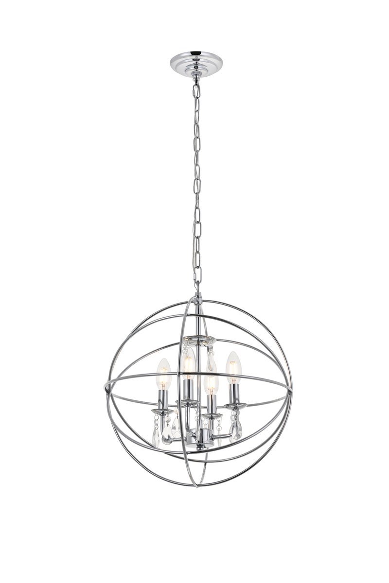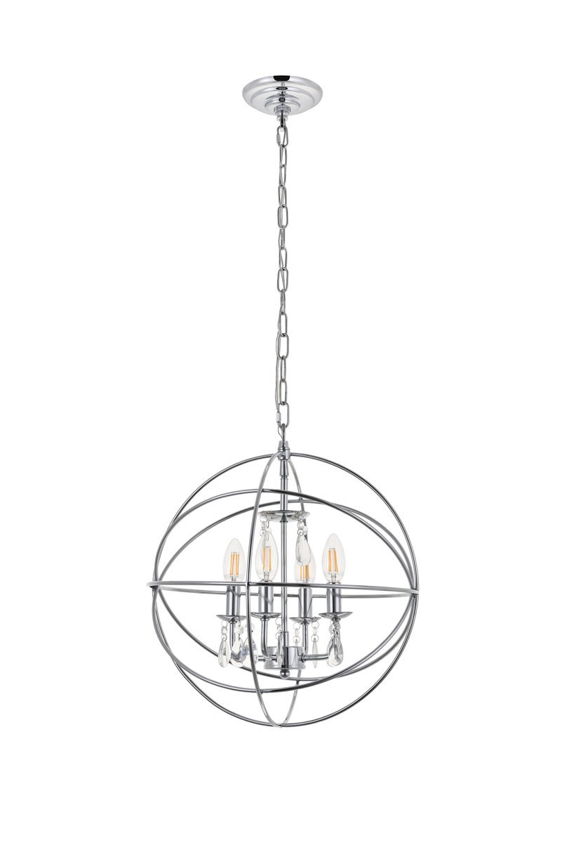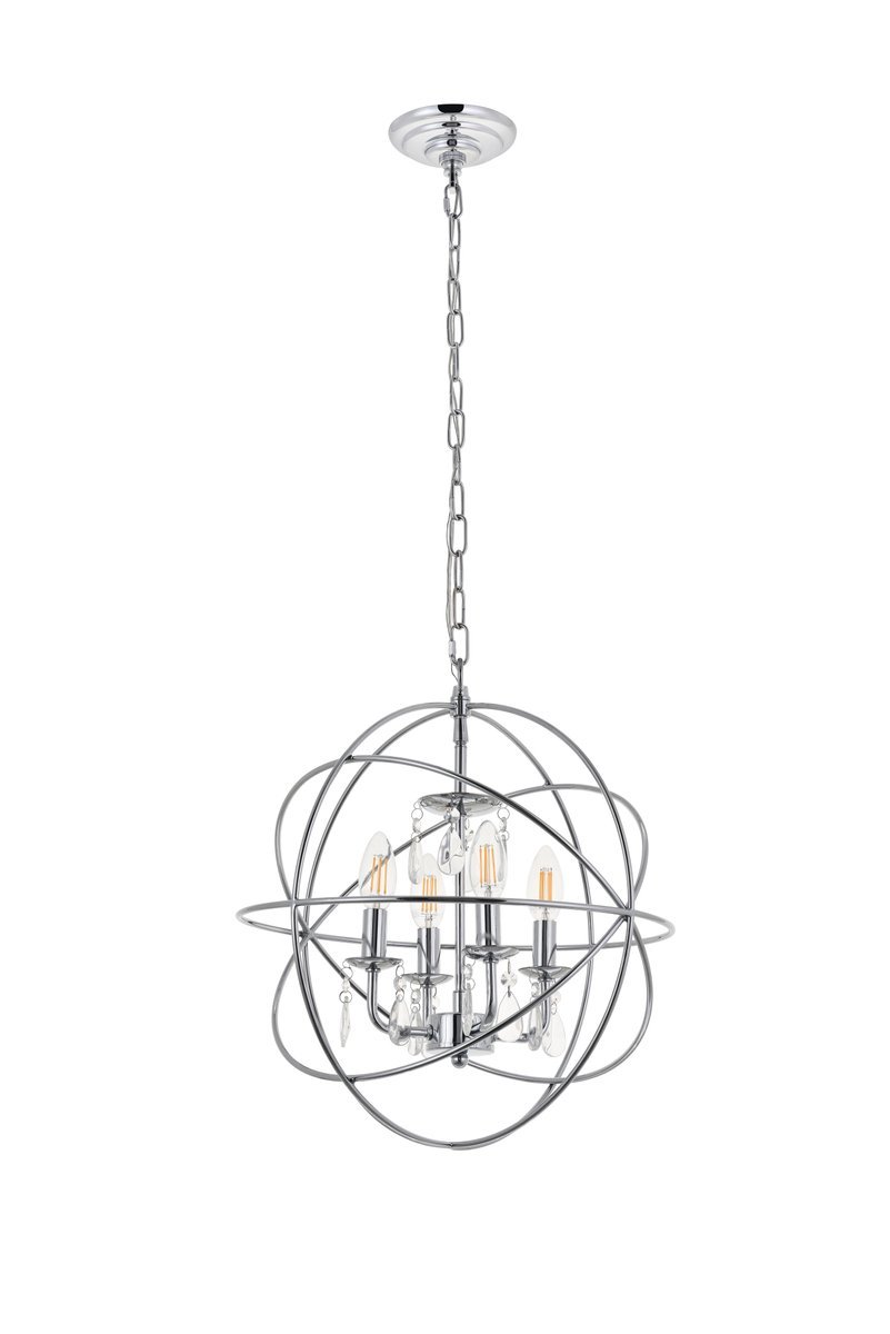 Chrome finish open gyroscopic frame with suspended crystals hanging from the bobeche, offering a stylish old world charm