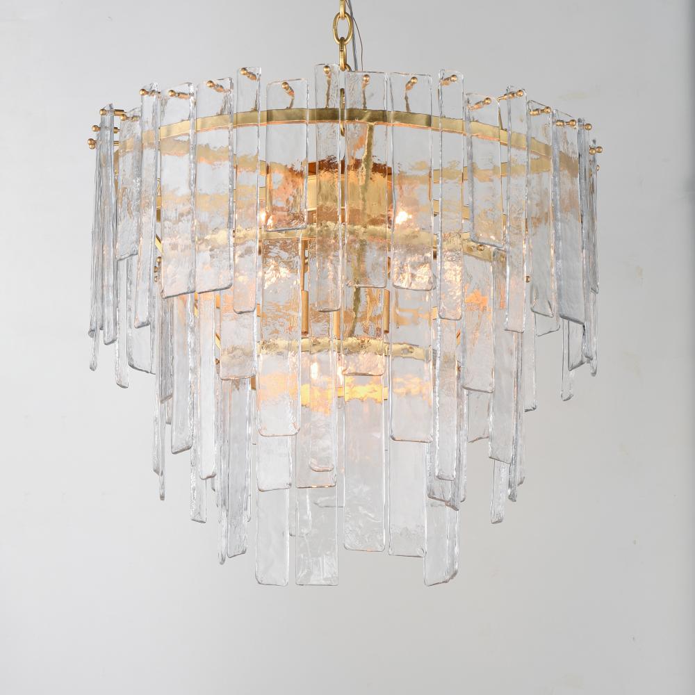 Gracefully flowing molten glass panels with uniquely organic aesthetic encircle rings of rich Darkened Bronze metal or hand-applied Gold Leaf. This refined interpretation of tiered glass pendants exudes warmth and elegance, effortlessly blending a moody am