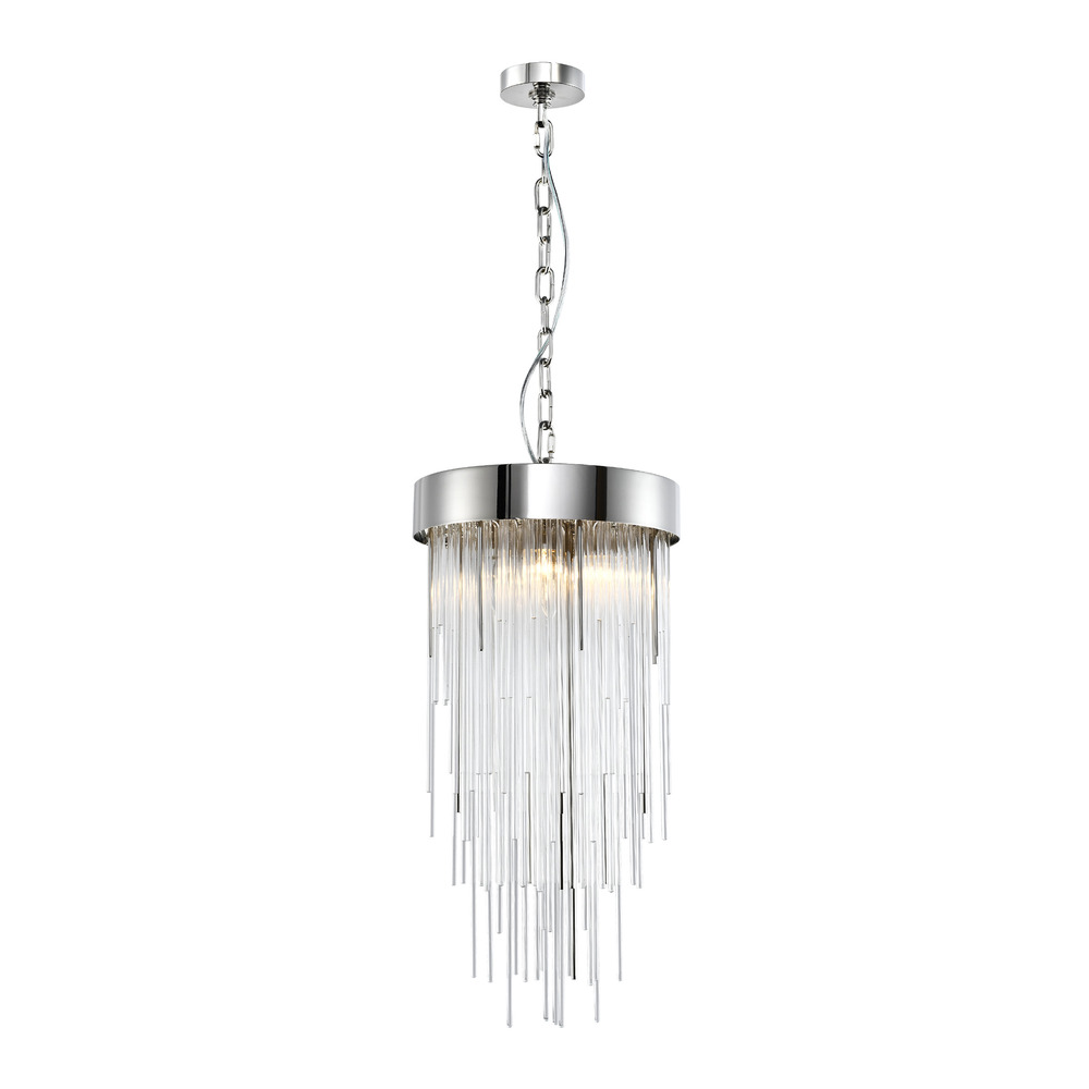 4-Light 12" Round Waterfall Crystal Pendant Light with Multi-Sized Clear Curved Crystal Stems combined with Solid Metal Stems. Refined Metal Details with our Luxurious Polished Nickel Finish and Flush Mount Convertible.