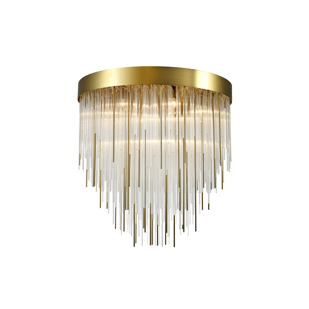 12-Light 30" Round Waterfall Crystal Chandelier with Multi-Sized Clear Curved Crystal Stems combined with Solid Metal Stems. Refined Metal Details with our Premium Aged Brass Finish and Flush Mount Convertible.
