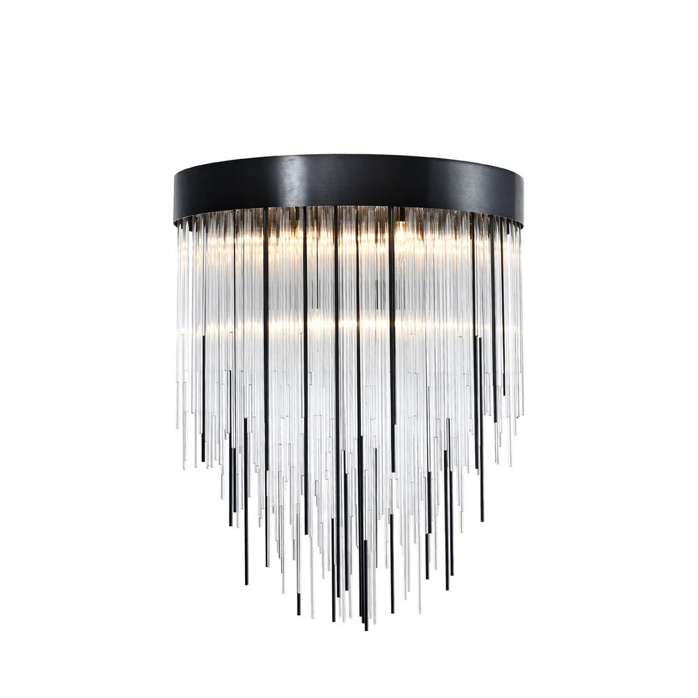 12-Light 30" Round Waterfall Crystal Chandelier with Multi-Sized Clear Curved Crystal Stems combined with Solid Metal Stems. Refined Metal Details with our Sleek Satin Brushed Black Finish and Flush Mount Convertible.