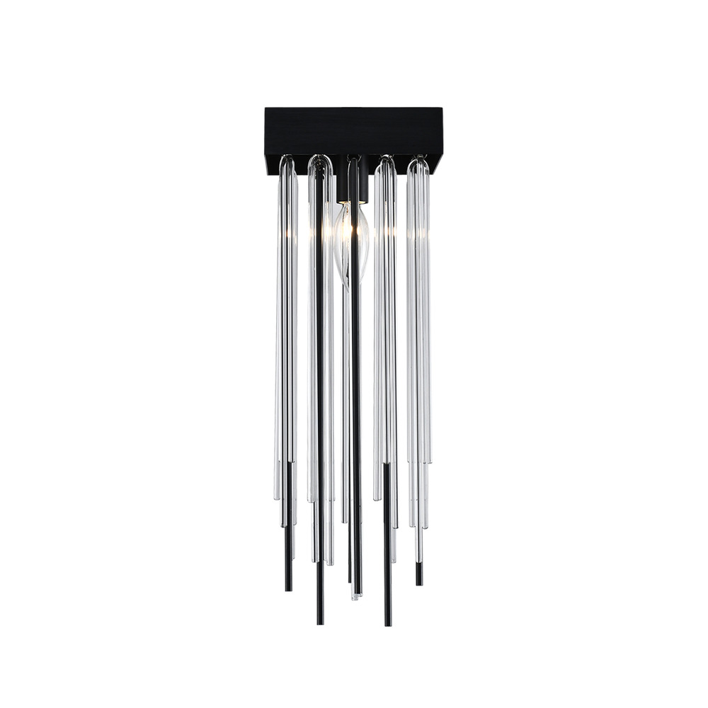1-Light 6" Square Waterfall Crystal Mini-Pendant Light with Multi-Sized Clear Curved Crystal Stems combined with Solid Metal Stems. Refined Metal Details with our Sleek Satin Brushed Black Finish and Flush Mount Convertible.