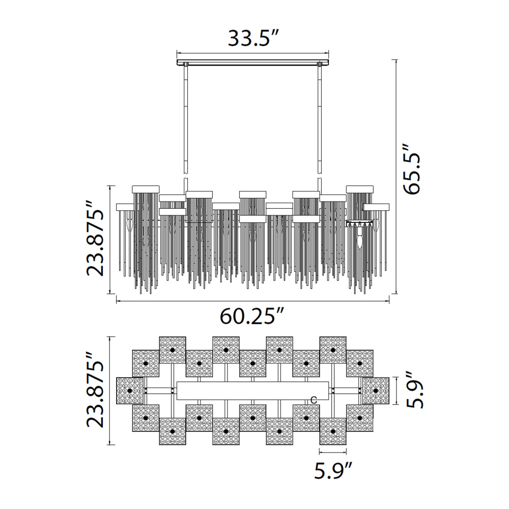 20-Light 60" Designer Cityscape Chandelier with Multi-Sized Clear Curved Crystal Stems combined with Solid Metal Stems. Refined Metal Details with our Premium Aged Brass Finish.
