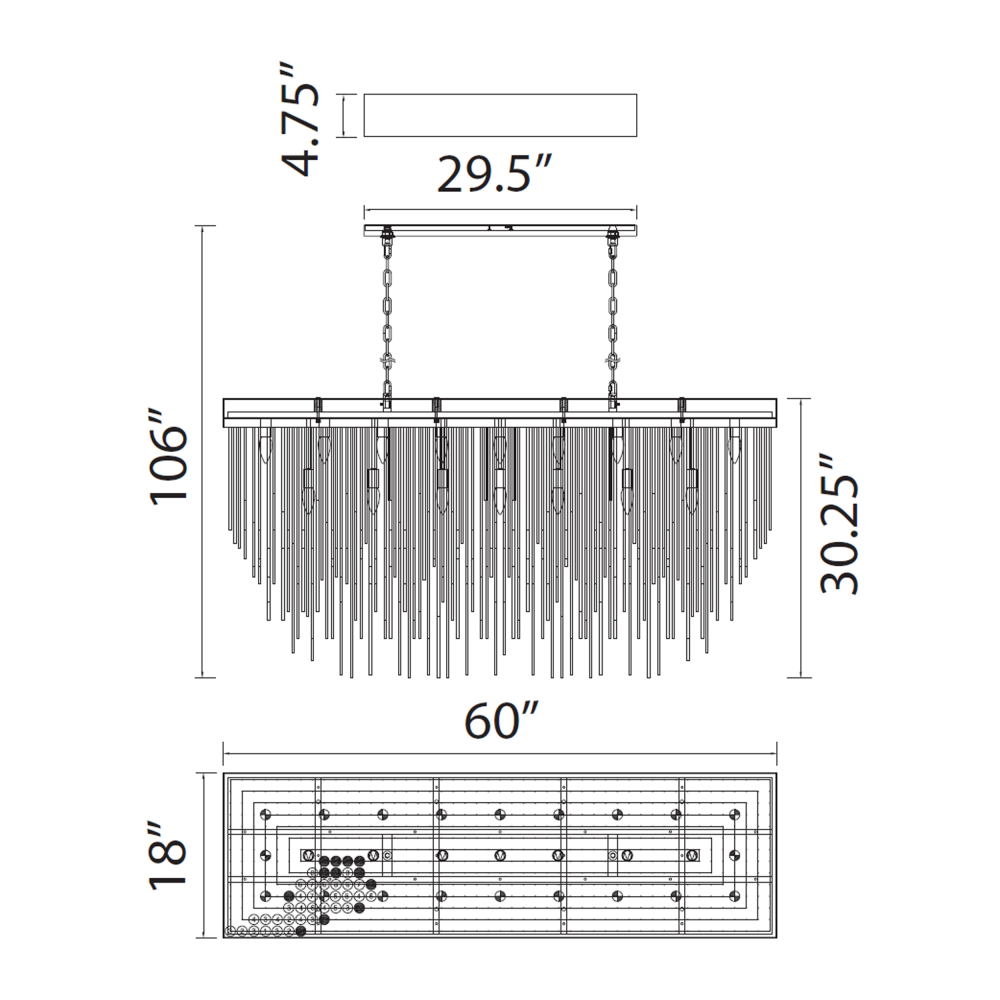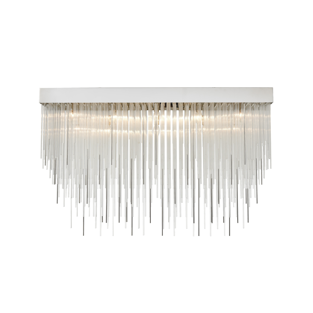 27-Light 60" Rectangular Crystal Dining Chandelier with Multi-Sized Clear Curved Crystal Stems combined with Solid Metal Stems. Refined Metal Details with our Luxurious Polished Nickel Finish and Flush Mount Convertible.