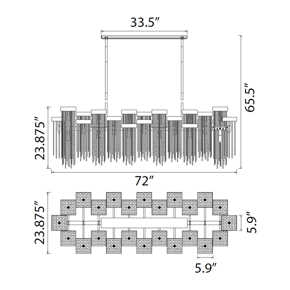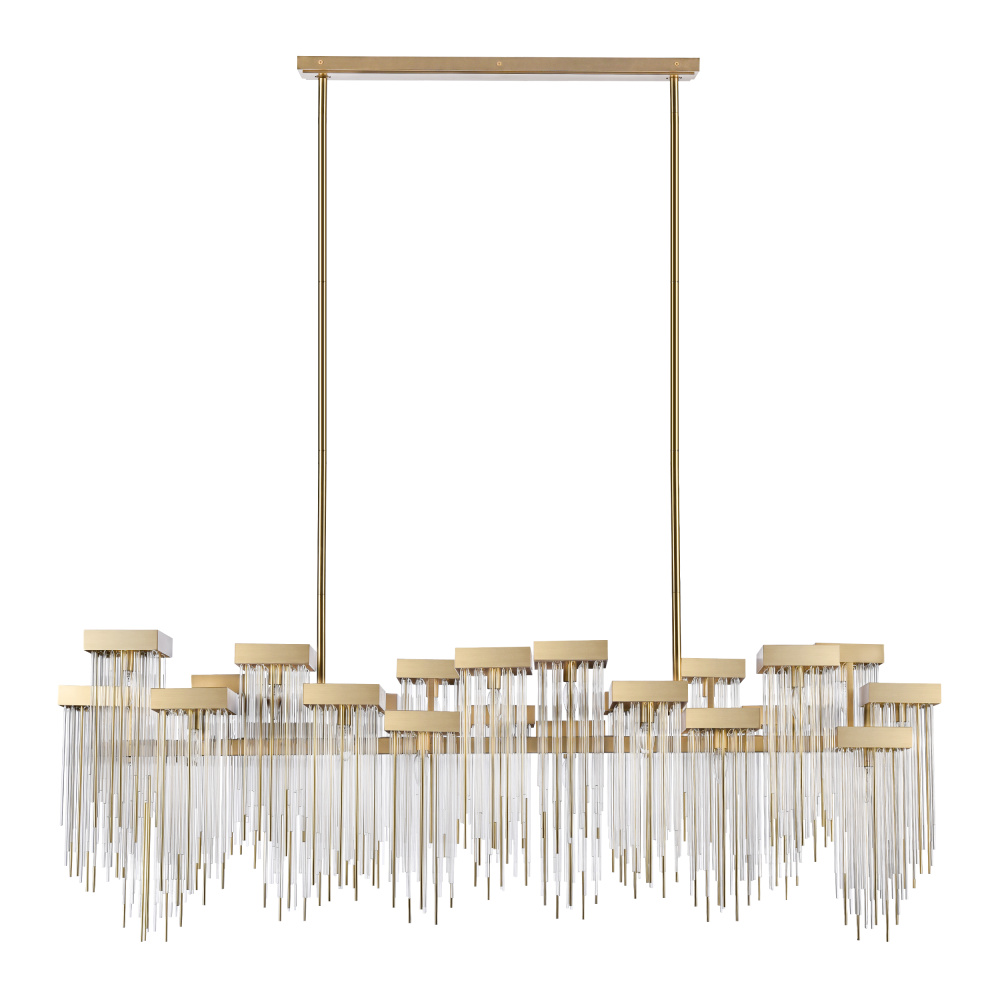 24-Light 72" Designer Cityscape Chandelier with Multi-Sized Clear Curved Crystal Stems combined with Solid Metal Stems. Refined Metal Details with our Premium Aged Brass Finish.