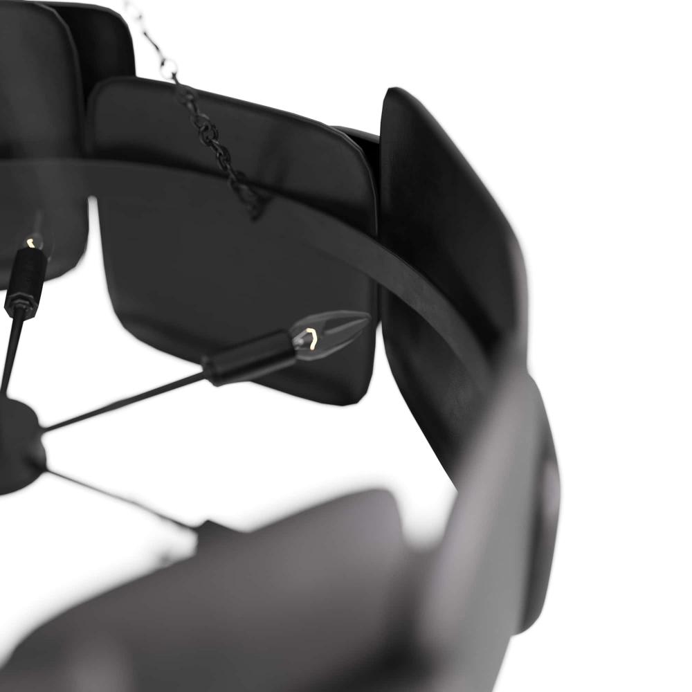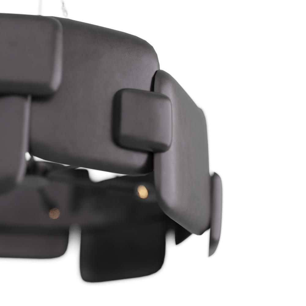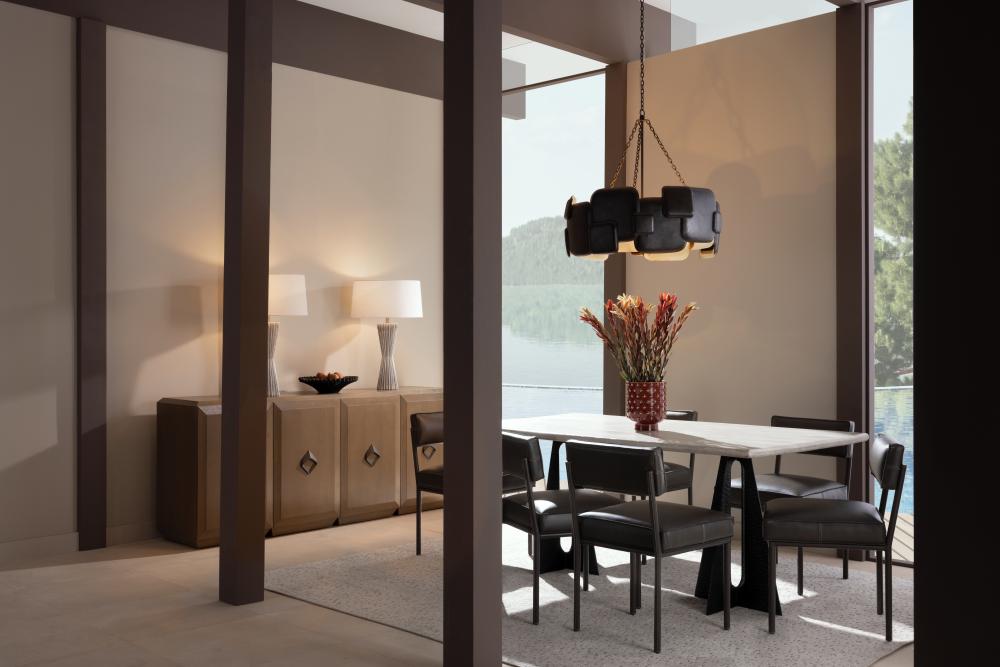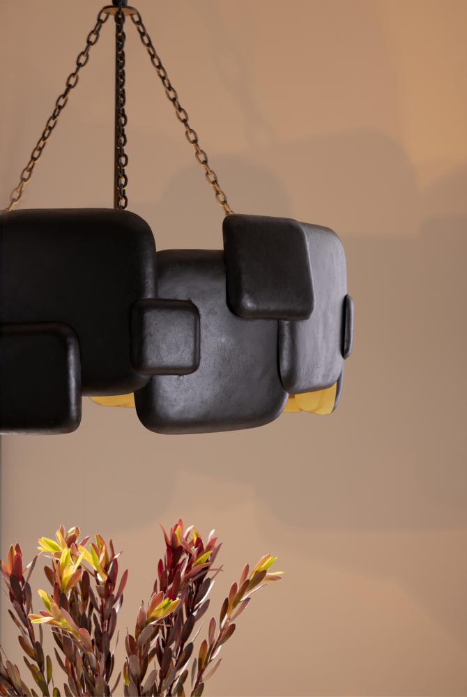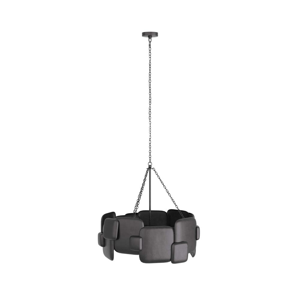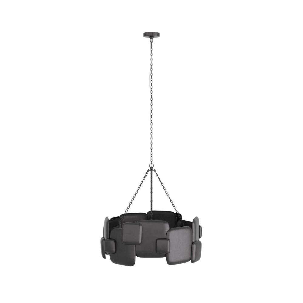 IN ANY SPACE, THE BRUTALIST-STYLE WAYLON CHANDELIER DEMANDS ATTENTION. THE HULKING FIXTURE IS FORGED IN A DRUM SILHOUETTE OF BLACKENED IRON, WITH OVERLAPPING, PILLOWY FORMS. THE CHANDELIER IS FASHIONED WITH A PIPE AND CHAIN LINK SUSPENSION, ALSO IN BLACKENED IRON. FINISH WILL VARY.