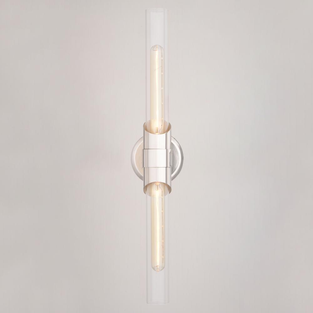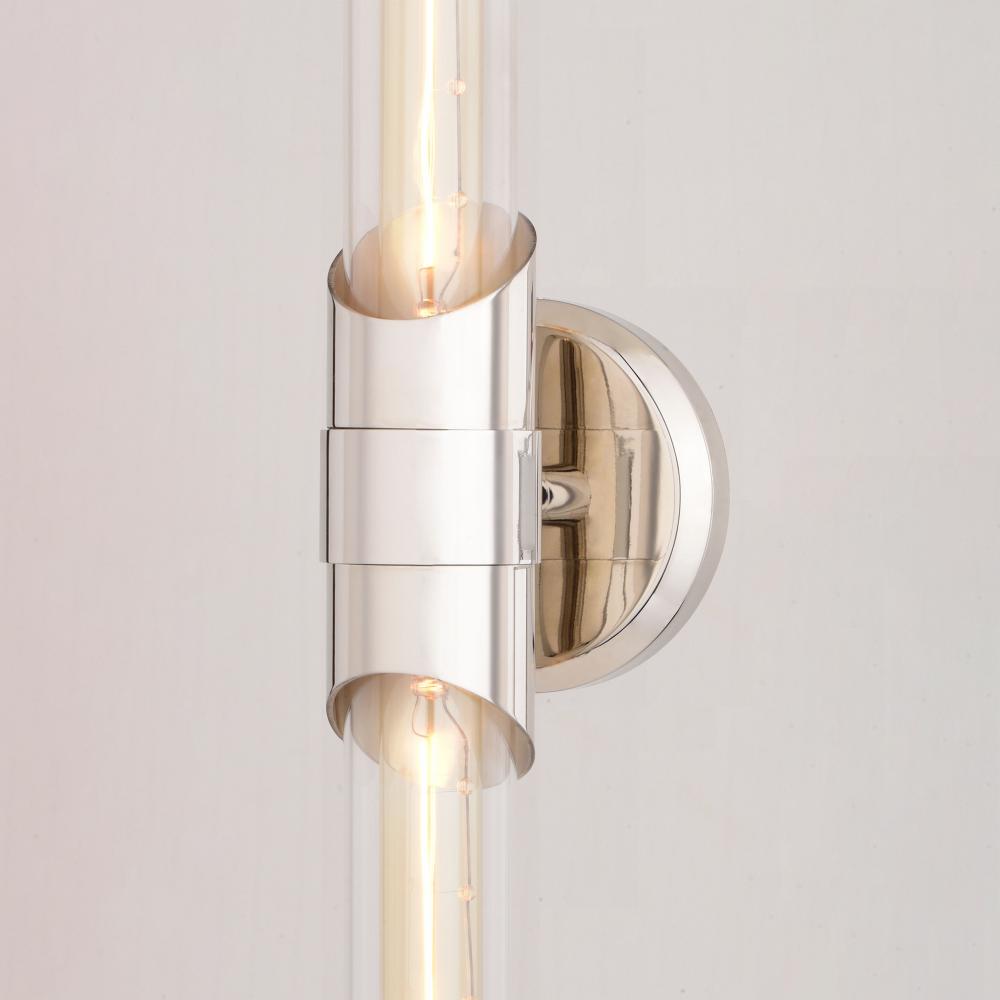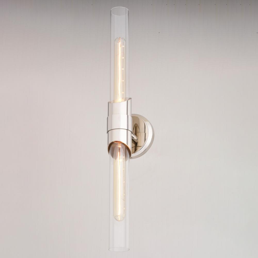 Long cylindrical glass set in an angle-cut holder, the Webster collection is the example of sophisticated elegance in simplicity at a good value. A polished nickel finish and clear glass combine to enhance the timeless mid-century modern design of this versatile wall light. Mount this fixture vertically or horizontally to suit your needs. This bathroom wall sconce is perfect over small vanities, as a pair over double sinks, or vertically on either side of a mirror.