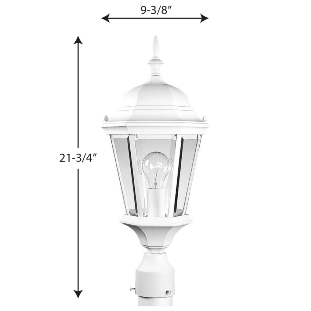 The Welbourne collection features hexagonal framework with vine inspired scrolls and clear beveled glass panels. Cast aluminum construction with durable powder coat finish. One-light post lantern. Textured White finish.