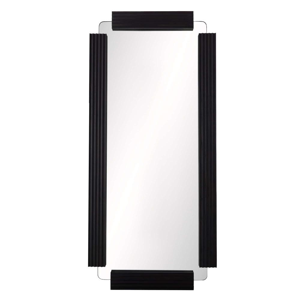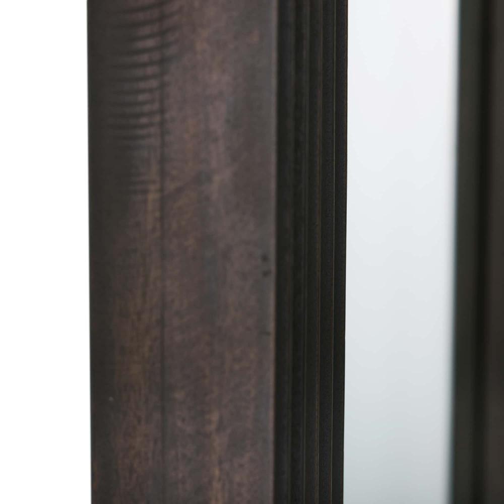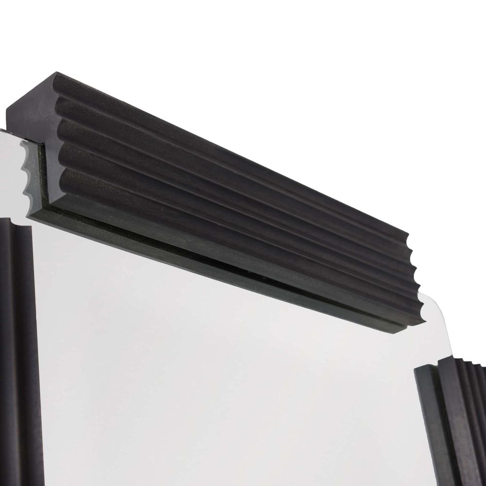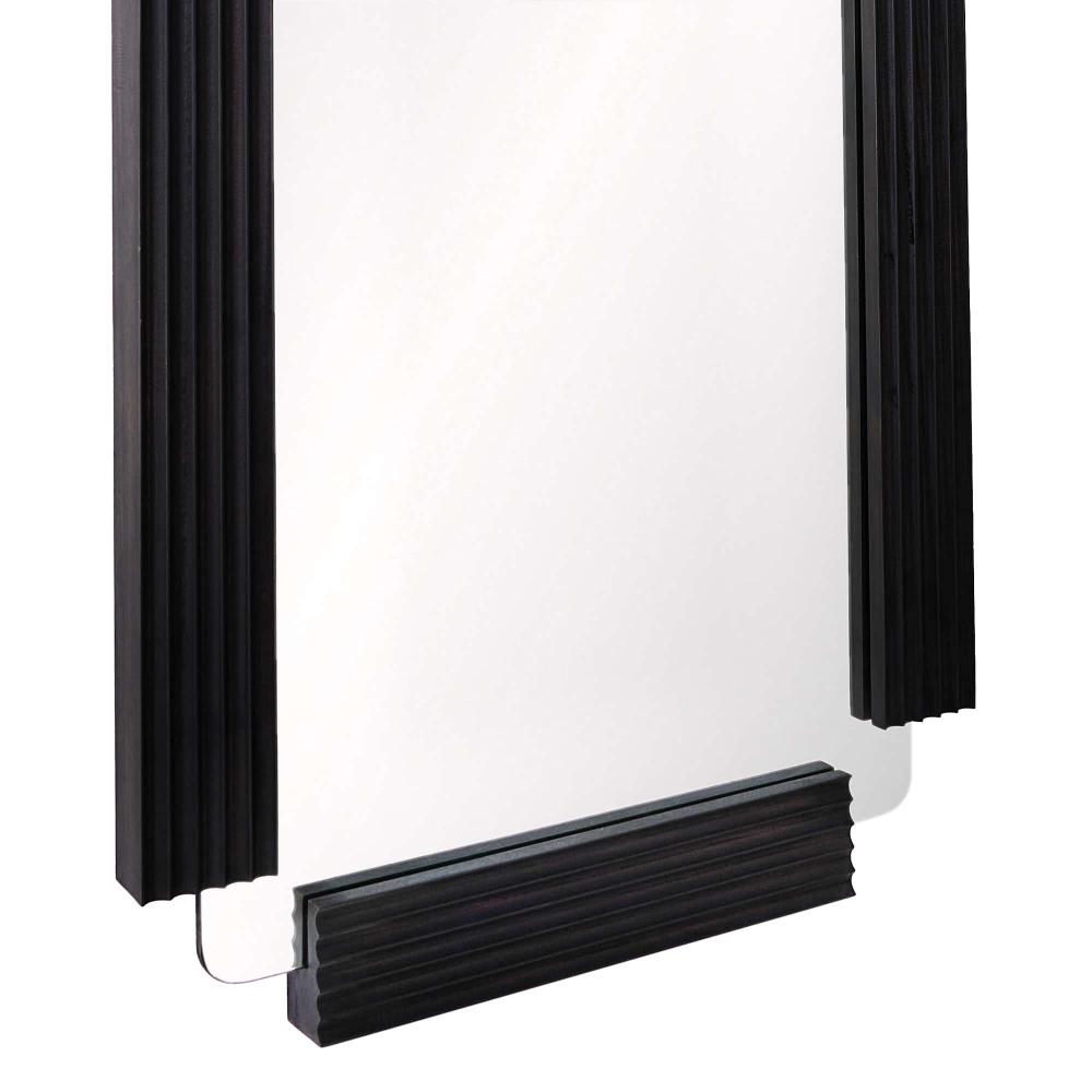 THE WELLER FLOOR MIRROR IS CRAFTED OF CARVED, EBONIZED MANGO WOOD BLOCKS THAT CRADLE A ROUNDED CORNER, INSET MIRROR. THE INTERSECTION OF MATERIALS CREATES DIMENSION AND THE ILLUSION THAT THE MIRROR IS FLOATING ON THE WALL. THE PIECE IS FITTED WITH A CLEAT FOR HANGING. FINISHES WILL VARY.