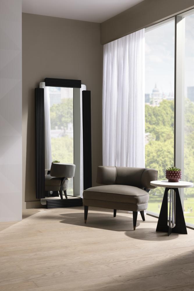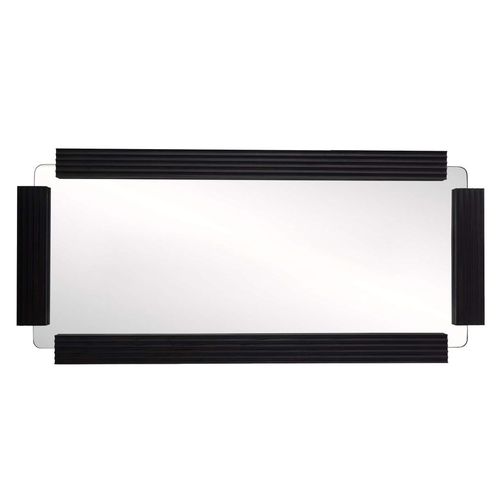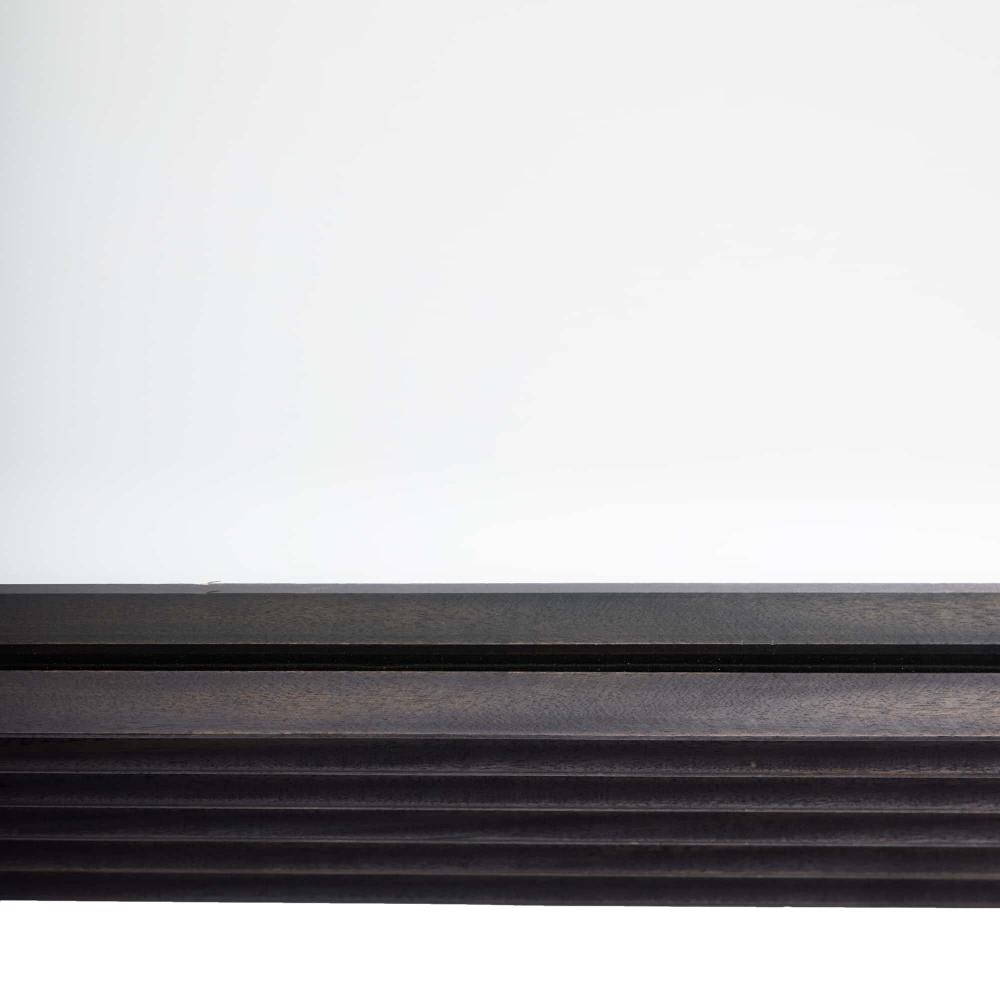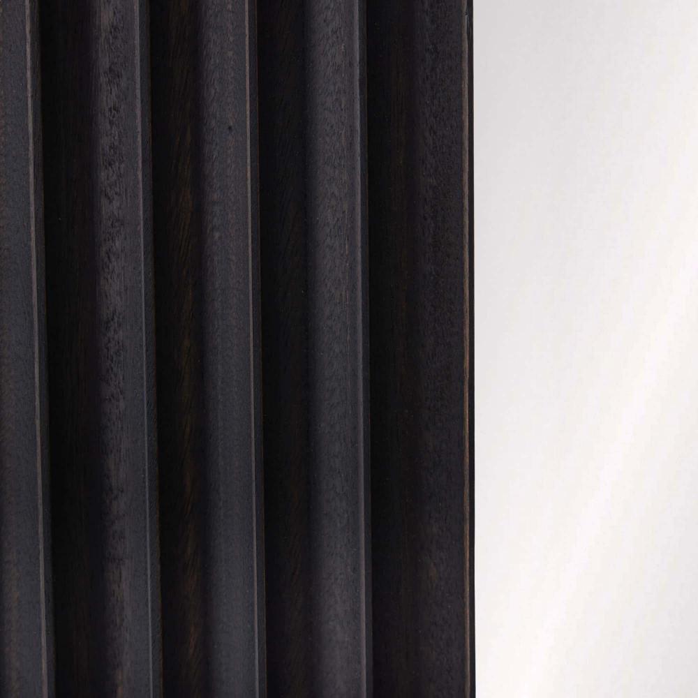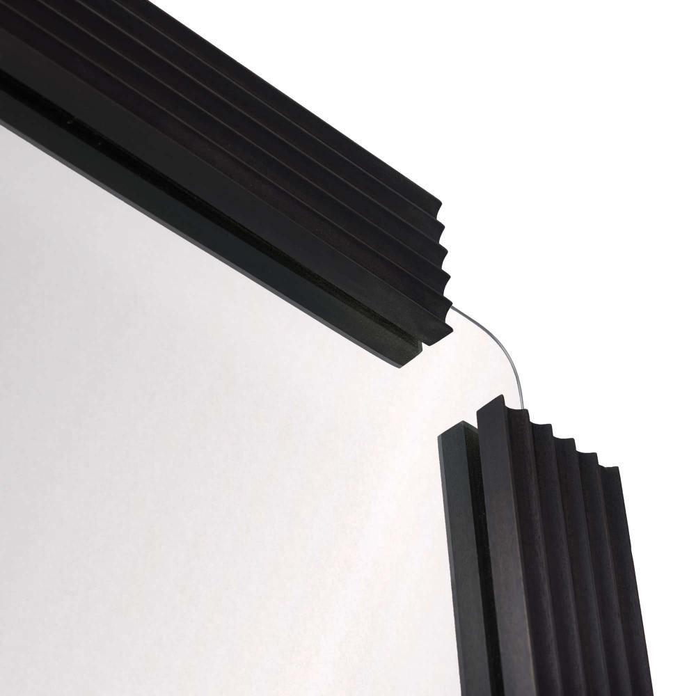 THE WELLER FLOOR MIRROR IS CRAFTED OF CARVED, EBONIZED MANGO WOOD BLOCKS THAT CRADLE A ROUNDED CORNER, INSET MIRROR. THE INTERSECTION OF MATERIALS CREATES DIMENSION AND THE ILLUSION THAT THE MIRROR IS FLOATING ON THE WALL. THE PIECE IS FITTED WITH A CLEAT FOR HANGING. FINISHES WILL VARY.