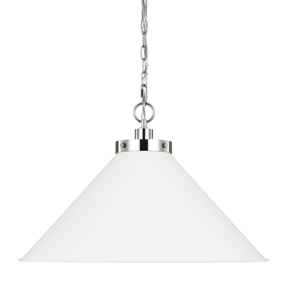 Inspired by various classic utility silhouettes - from factory lighting to barn sconces - capped by contrasting metal hardware. Each shade of the Wellfleet series by Chapman & Myers is available multiple sizes of 3 versatile profiles; either a flat farm dome, a traditional factory dome, or tapered cone. The shades are available with either a black or white finish and are paired with either a burnished brass or polished nickel collar, chain and canopy.