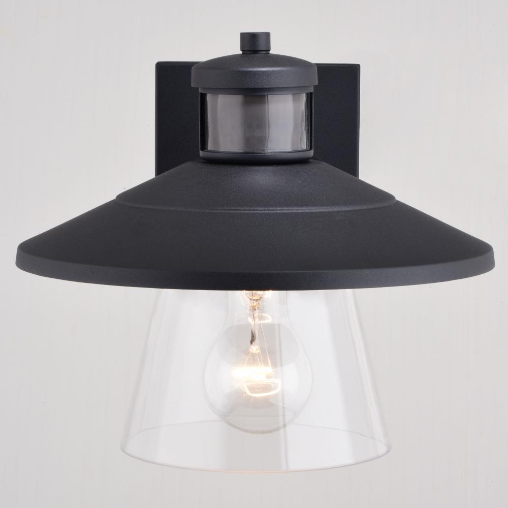 Constructed from weather-resistant steel material with a textured black finish and clear glass