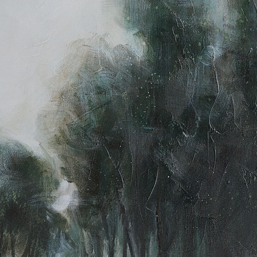 Bring texture and a dash of soothing color to any room with this sprawling landscape painting. A stylish choice for transitional spaces, this hand-painted canvas features loads of texture for eye-catching appeal. Measuring 60” x 30” and outfitted with a floating black oak frame, it’s ready to hang anywhere a large-scale impact is needed.