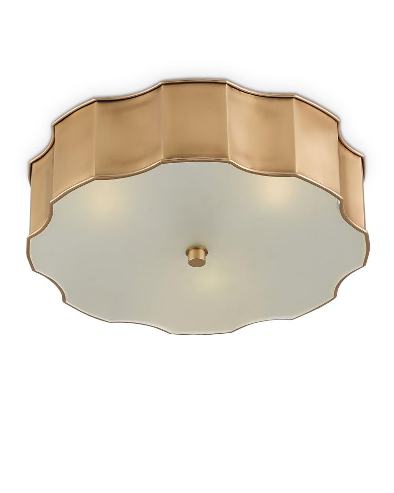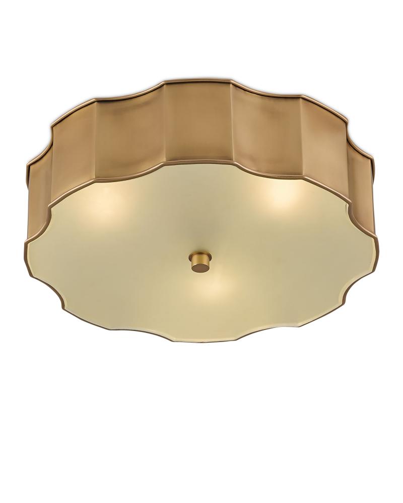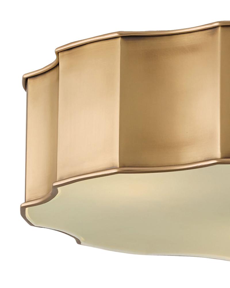 Tastefully restrained and endlessly adaptable, it's easy to see why the Wexford Flush Mount has been one of our bestsellers. The exterior ridges of this appealing three-light fixture, which are made of brass, have been treated to an antique brass finish. The warmth of the surface is a lovely complement to the soft glow produced by an opaque glass diffuser fitted with a finial in a matching antique brass.