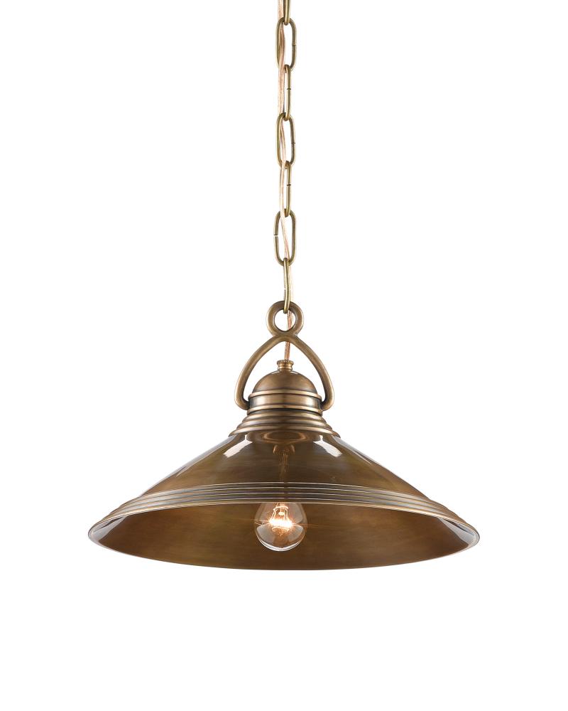 Our new Weybright Pendant references so many vintage industrial notes, it will have a nuts-and-bolts appeal to anyone who still dreams of the days of steamer ships and the local butcher who cleaved the freshest of meats to beams in his chill locker. Made of brass that has been treated to a vintage brass finish, the design notes that make this luminary so special are the sophistication of the shape of the hook that fastens the fixture to the chain and the ribbed details on the shade.