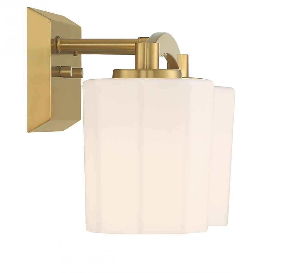 Get understated glamour for the bathroom with this Savoy House Whitney 2-light bath vanity light. Fluted shades of opal etched glass offer up a flattering glow, the curving arm adds intrigue and the warm brass finish adds versatility. Whitney is 8" in height, 14" in width and extends 6.5" from the wall. It uses two standard size bulbs of up to 60 watts per bulb (bulbs not included).