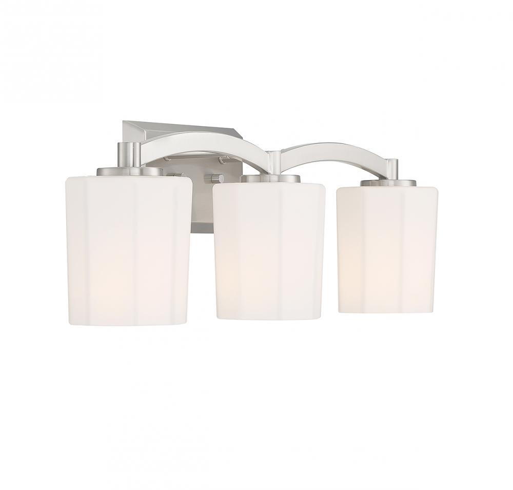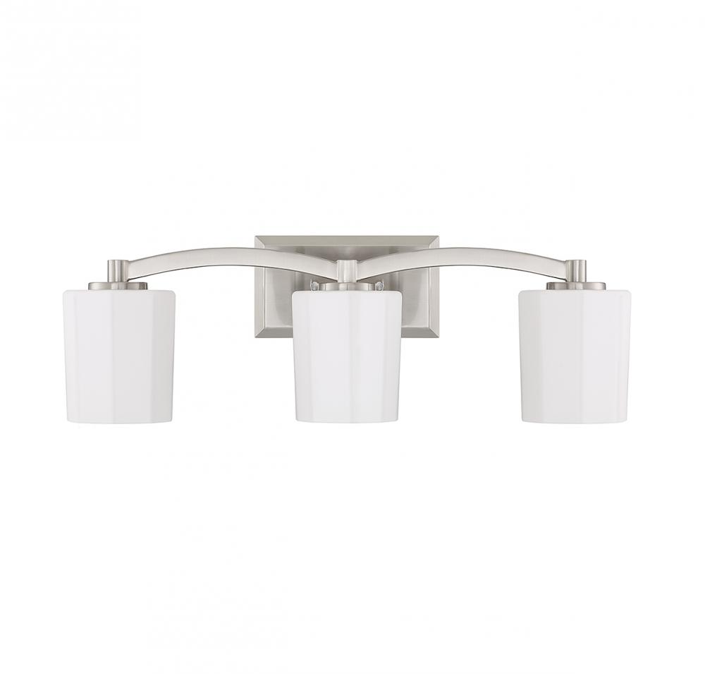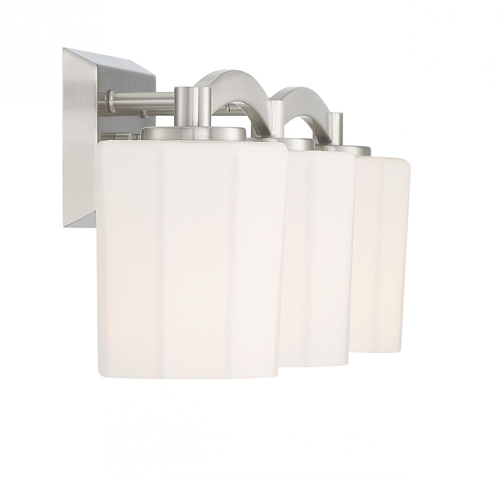 Get understated glamour for the bathroom with this Savoy House Whitney 3-light bath vanity light. Fluted shades of opal etched glass offer up a flattering glow, the curving arm adds intrigue and the satin nickel finish adds versatility. Whitney is 8" in height, 24" in width and extends 6.5" from the wall. It uses three standard size bulbs of up to 60 watts per bulb (bulbs not included).