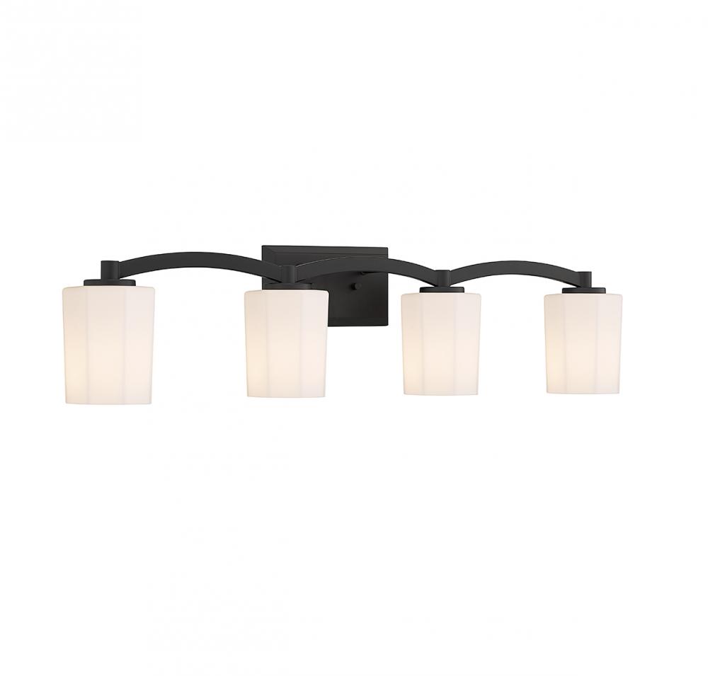 Get understated glamour for the bathroom with this Savoy House Whitney 4-light bath vanity light. Fluted shades of opal etched glass offer up a flattering glow, the curving arm adds intrigue and the matte black finish adds versatility. Whitney is 8" in height, 33" in width and extends 6.5" from the wall. It uses four standard size bulbs of up to 60 watts per bulb (bulbs not included).