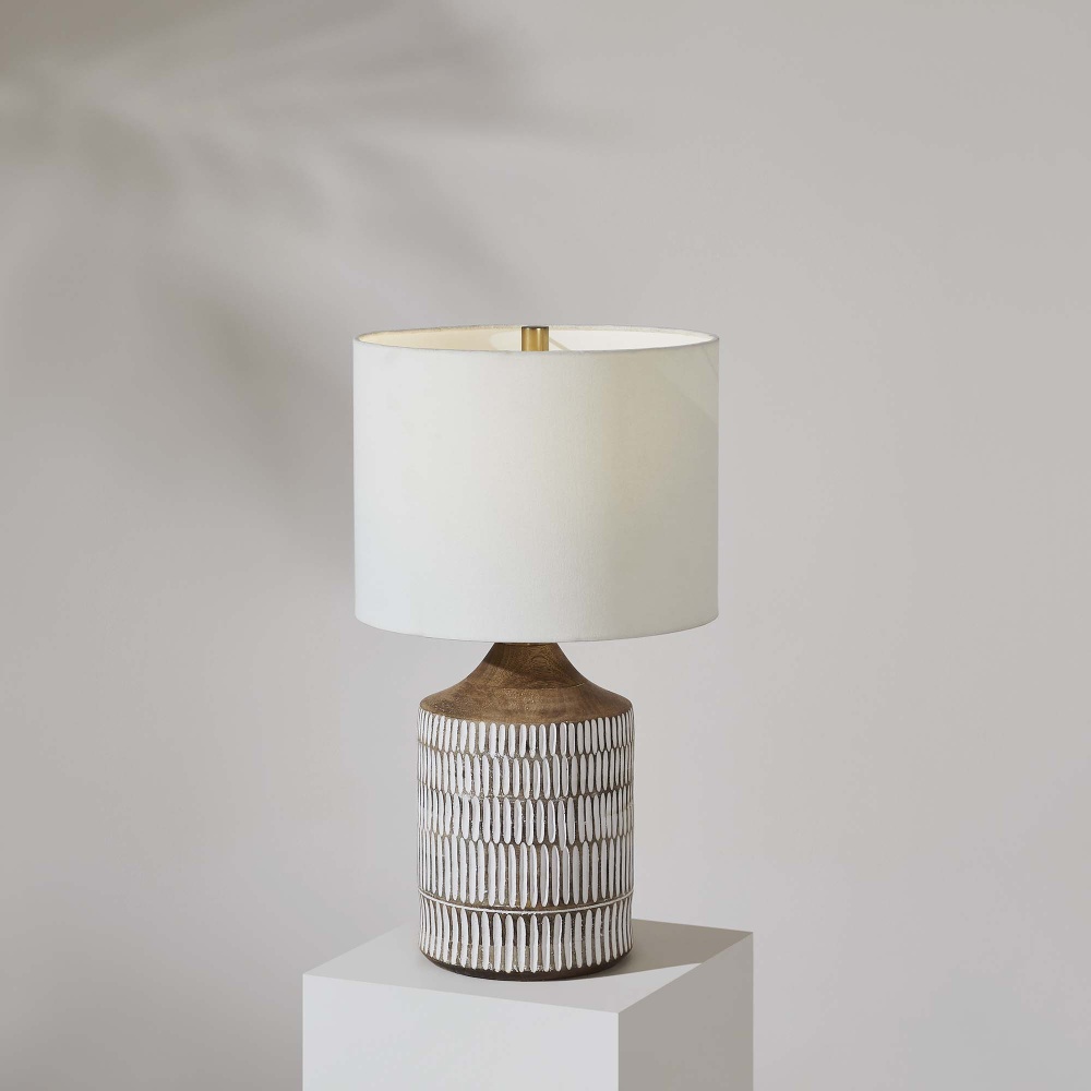 A tribal influence enters the bedroom interior through this table table lamp design. Set on a single bedside table or pair of bedside tables, this piece completes the comforting atmosphere one hopes to create in the space. Featuring a juxtaposition of cotton and mango wood, this table lamp has an inherent effortless quality that radiates from every angle.