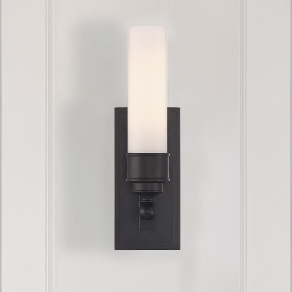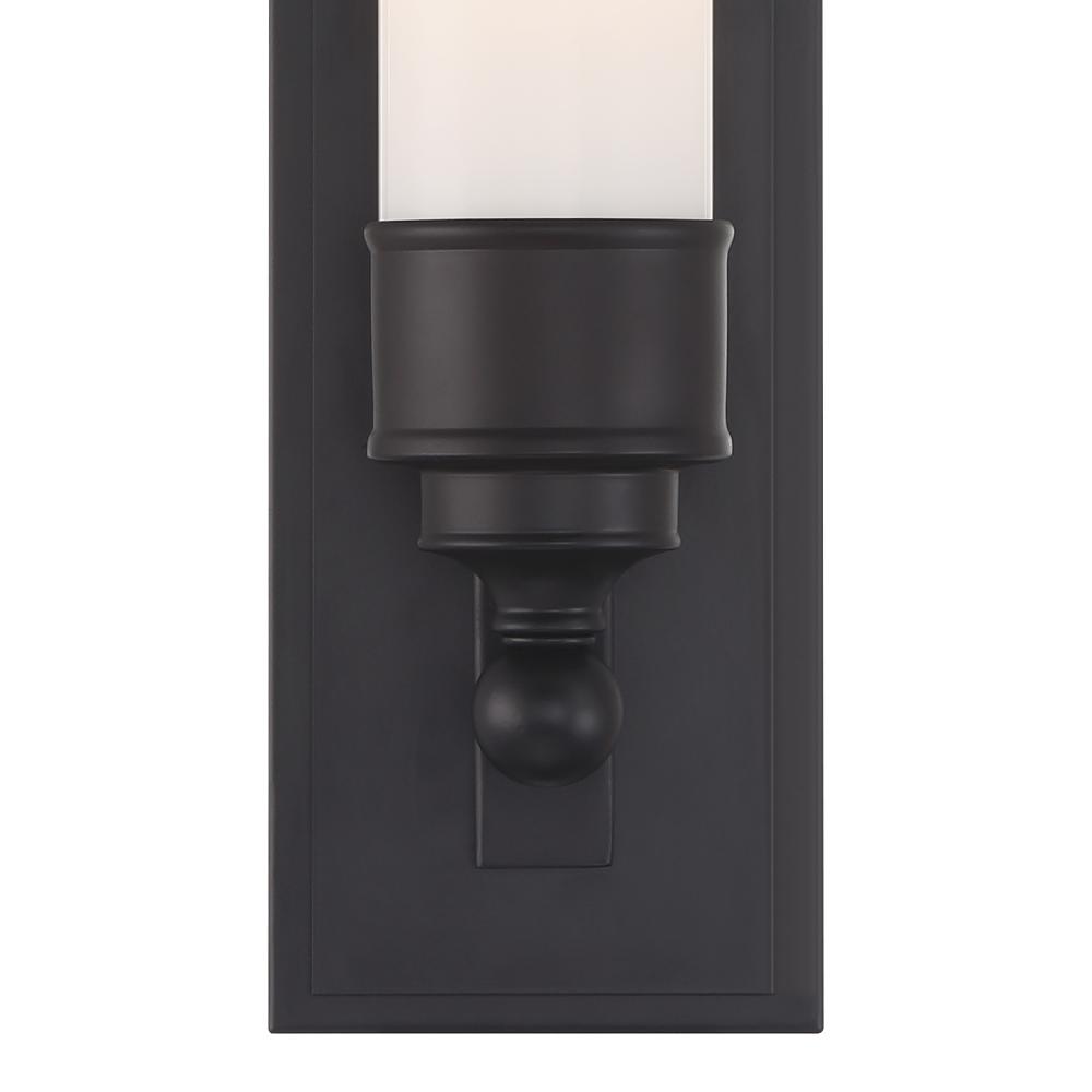 White cylindrical glass shade and rectangular back plate with stepped detailing. LED bulb included.