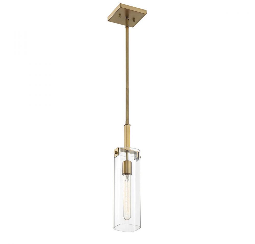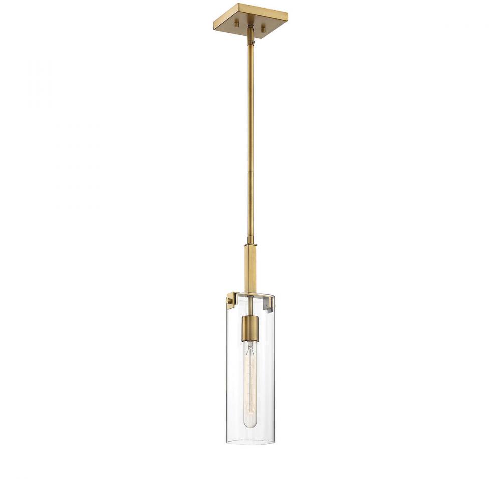 This Savoy House Winfield 1-light mini pendant showcases a bold, slim look with a shade of clear glass, thoughtful minimal detailing and a warm brass finish.