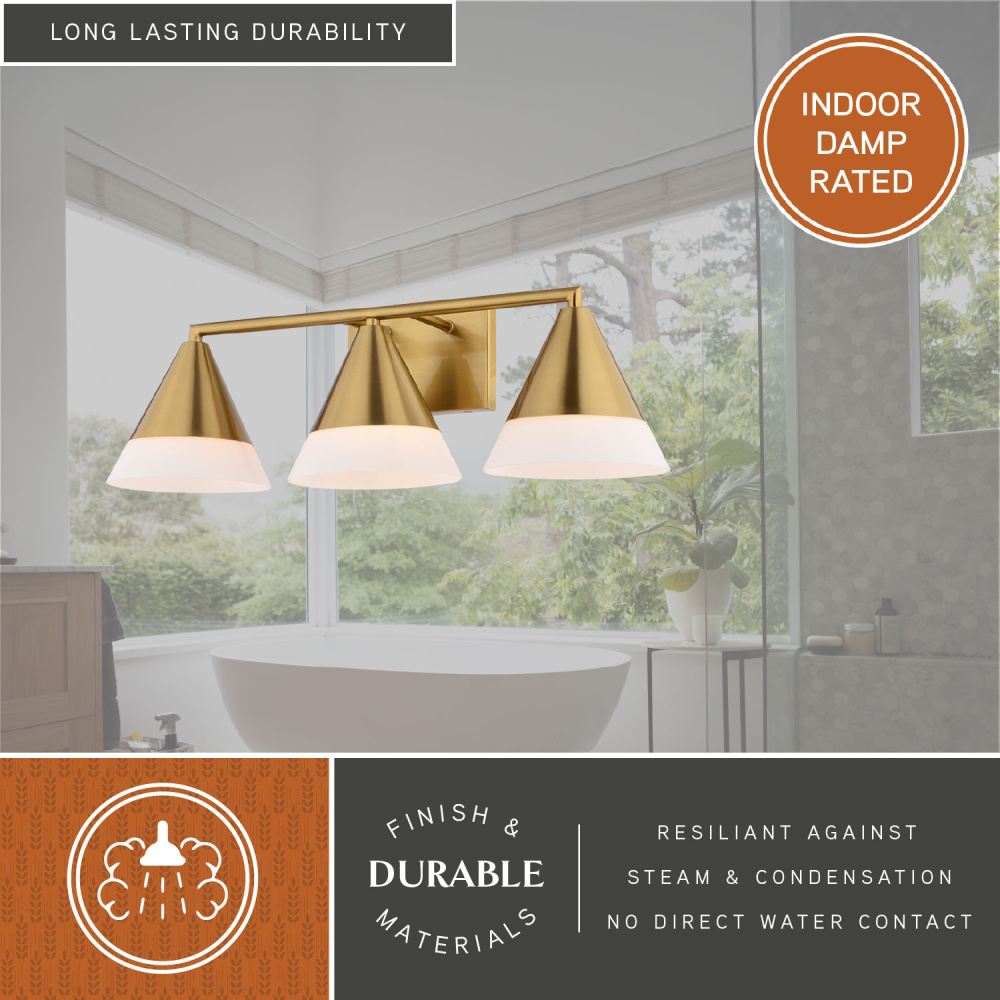 Indulge in affordable luxury with the Winthrop vanity light. This trendsetting wall fixture showcases the sought-after combination of tapered metal and glass, bringing a touch of modern sophistication to your bathroom. The harvest gold finish and clean lines complement a variety of decors, from mid-century modern to contemporary, while the three lights provide ample illumination for your daily routine. Update your bathroom with this designer-inspired piece.