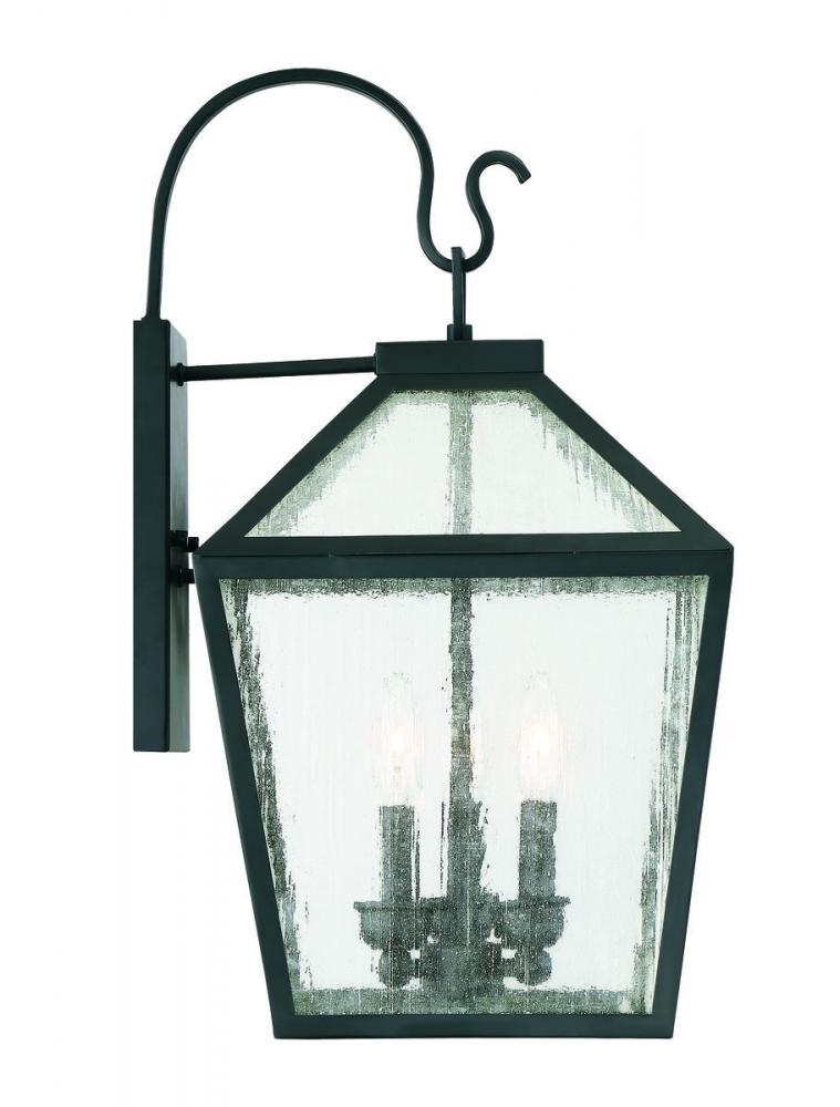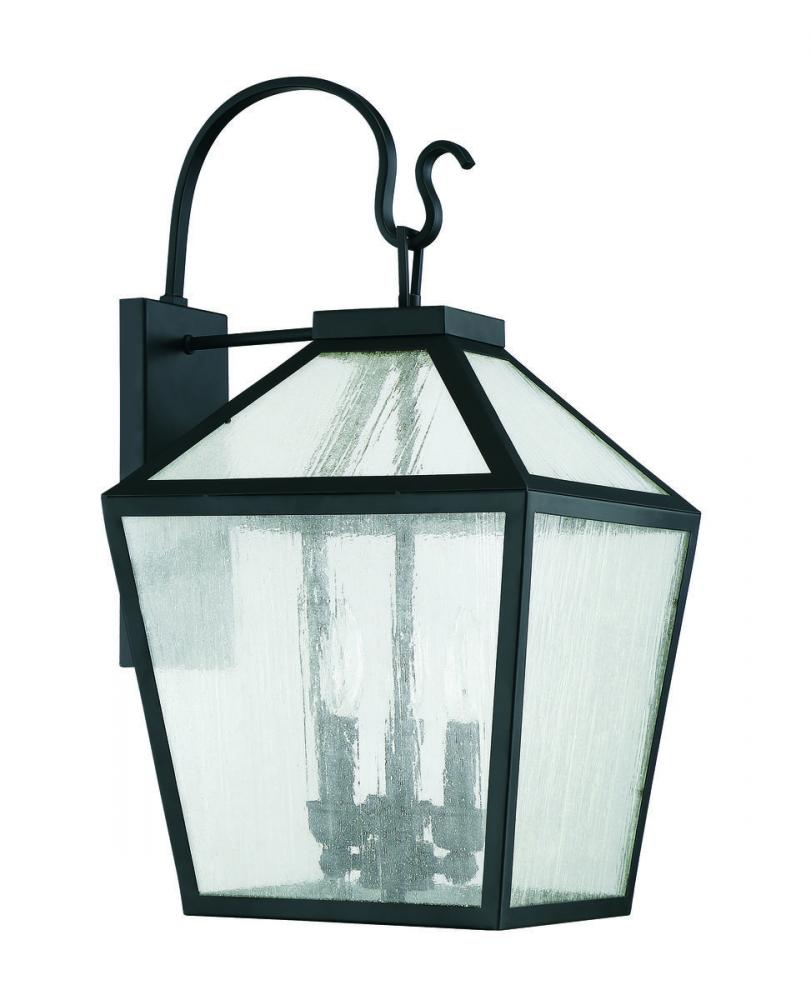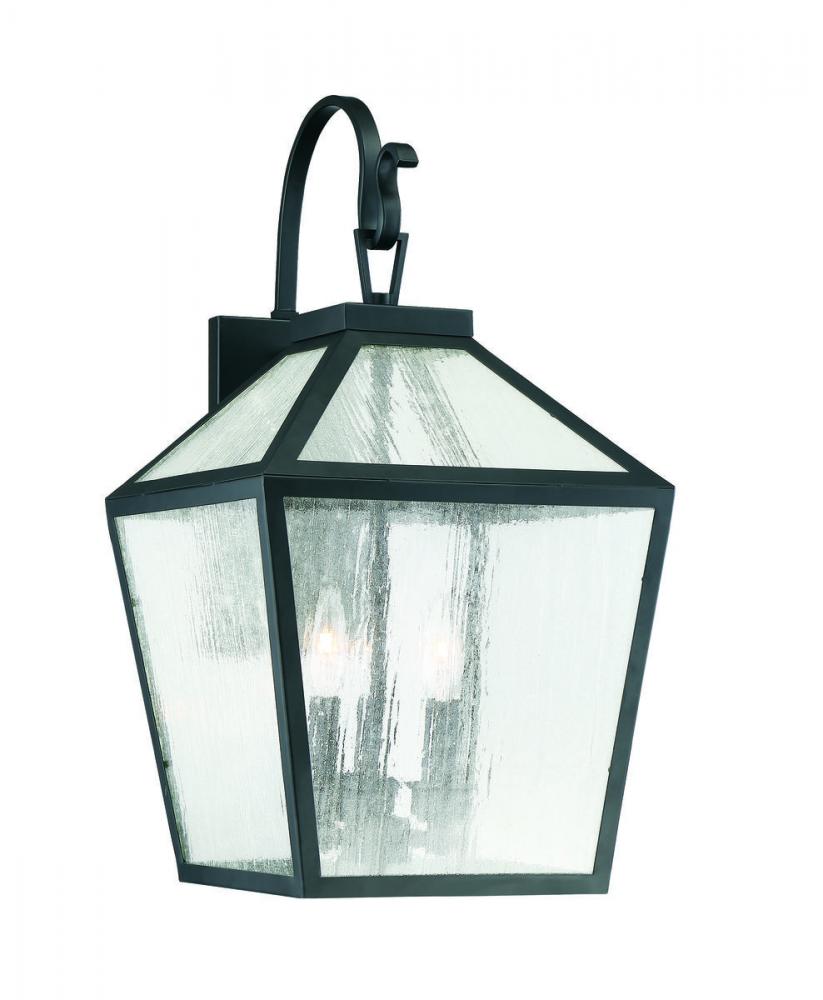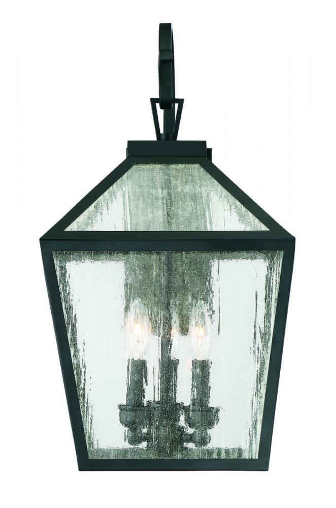 The traditional charm of vintage lanterns blends beautifully with streamlined, contemporary appeal in this Savoy House Woodstock 3-light outdoor wall lantern. Everyone who enters your home will feel welcomed and appreciate its classic style. Finished in matte black with clear seeded glass panes that add wonderful textural interest. The 23.5" high by 12" wide size makes it easy to place multiples of these lanterns on the walls of your porch, patio, sunroom, garage or pergola. Uses 3 candelabra size bulbs of up to 60 watts each. Wet area rated.