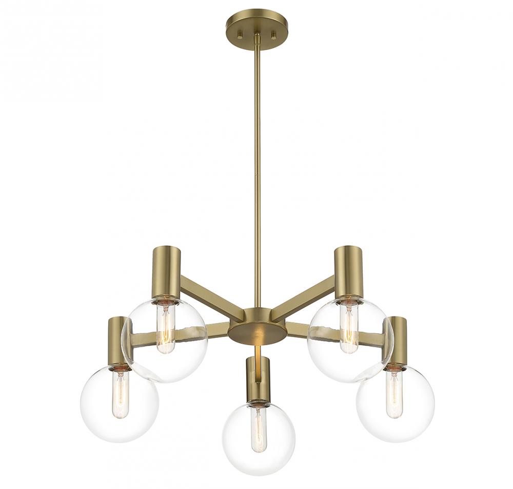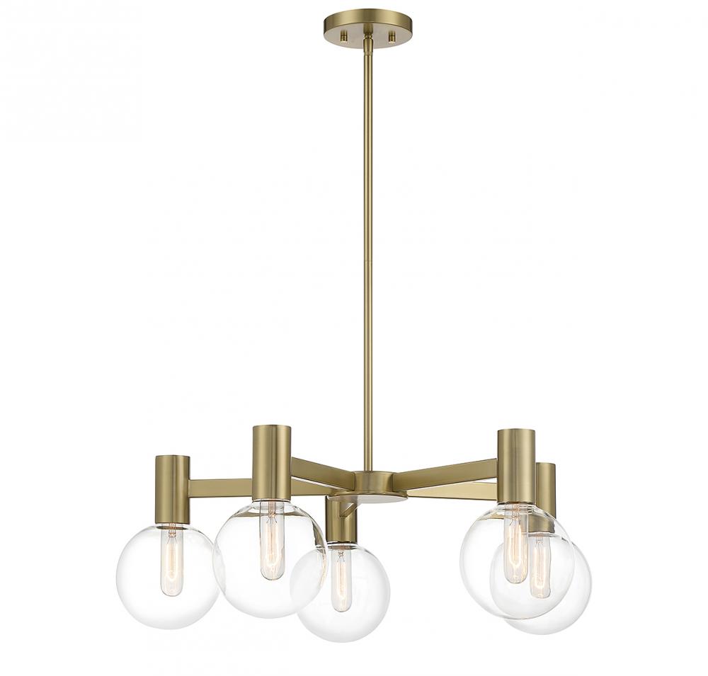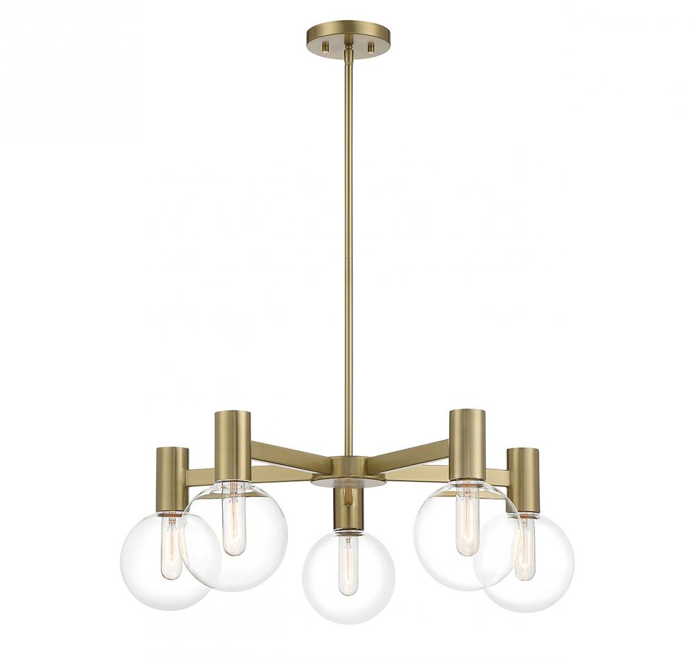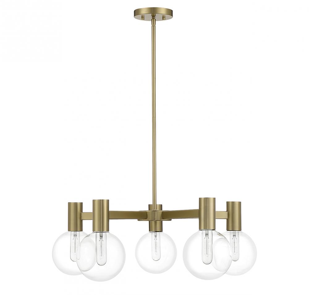 This Savoy House Wright 5-light chandelier showcases streamlined style that makes it ideal for any space. Round clear glass shades add an extra dimension and extra protection for the light bulbs within. Warm brass finish. Wright is 28" in width and has an adjustable height ranging from 10.5" to 64". Comes with four 12" downrods and one 6" downrod. Uses 5 standard size bulbs of up to 60 watts per bulb (bulbs not included). We recommend using tubular shaped bulbs.