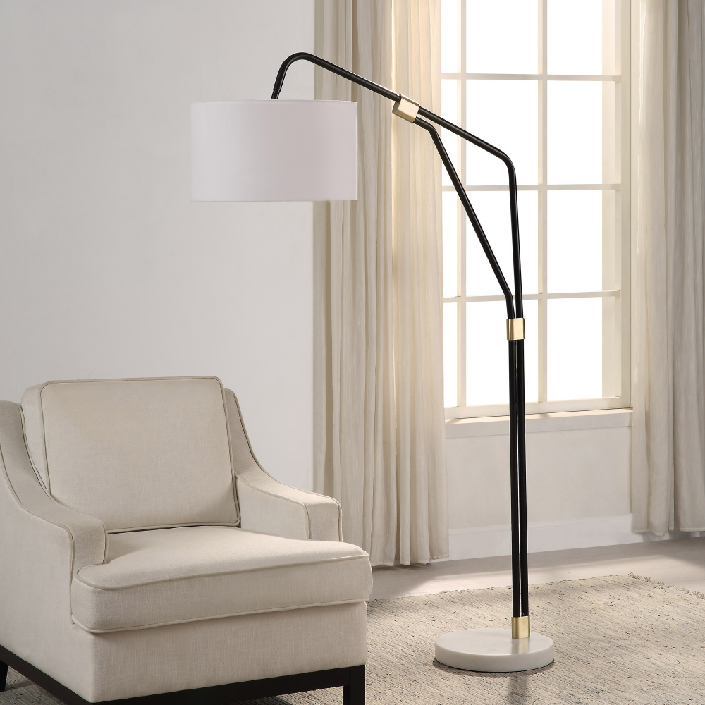 The bedroom or living room interior is elevated to new heights when this floor lamp enters the space. This piece serves as a luxe, streamlined work of art in the home. When lit, it envelops the room in a warm, glow while offering utility. The composition of this lamp, powder-coated iron, marble base and cotton shade, makes it optimally suited for industrial and contemporary interiors.