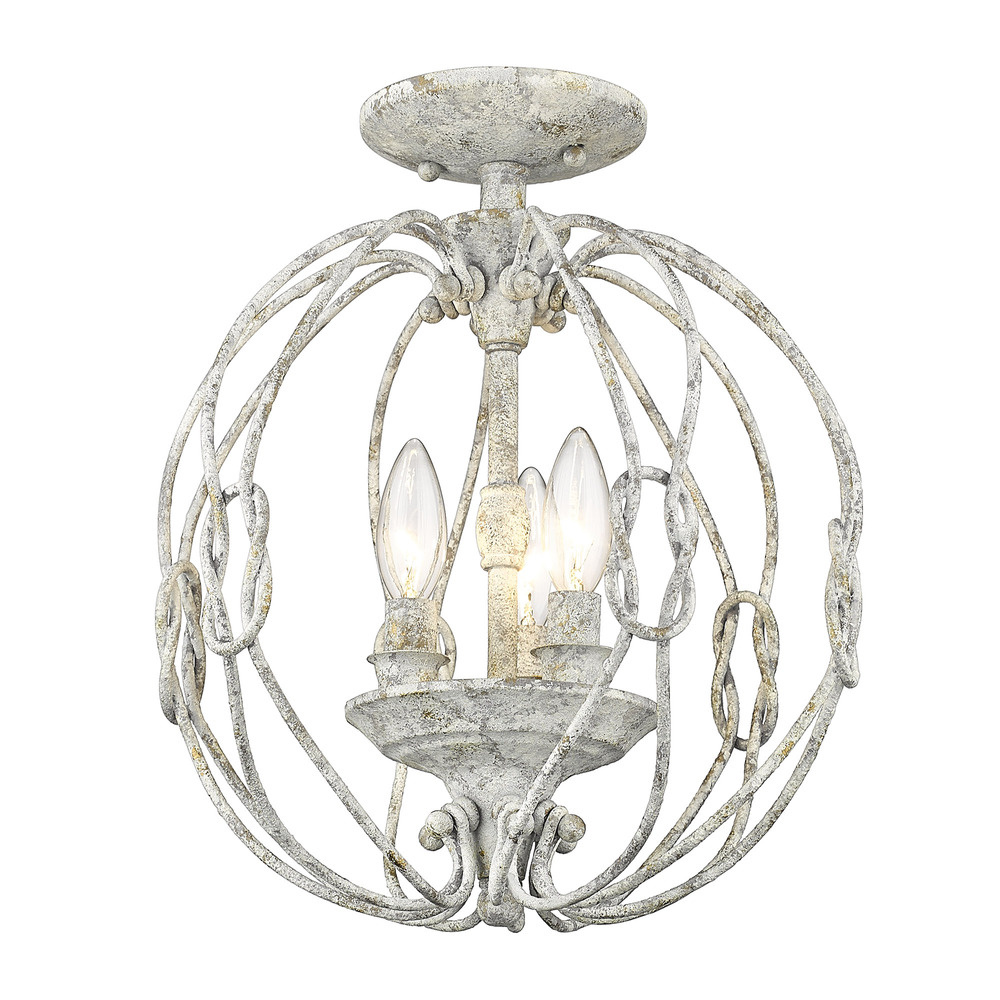 Bring vintage-inspired elegance into your home with the Wry Lighting Antoinette 3-light Semi-Flush Mount in Oyster. This fixture showcases a beautifully distressed design that creates a welcoming atmosphere perfect for any setting. Crafted without a shade, this semi-flush mount allows the three candelabra bulbs to shine through, illuminating your space with a gentle glow. The oyster finish adds a rustic charm, while its unique texture tells a story of weathered beauty. Versatile for kitchens, bedrooms, or living areas with mid-height ceilings, this fixture is damp location rated, making it suitable for covered and semi-enclosed spaces. Overall dimensions: 12.63"W x 14.38"H x 12.63"D, requiring 3 E12 Candelabra base bulbs (not included) with a maximum wattage of 60 per bulb. Add a cozy touch to your home with this enchanting semi-flush mount light.
