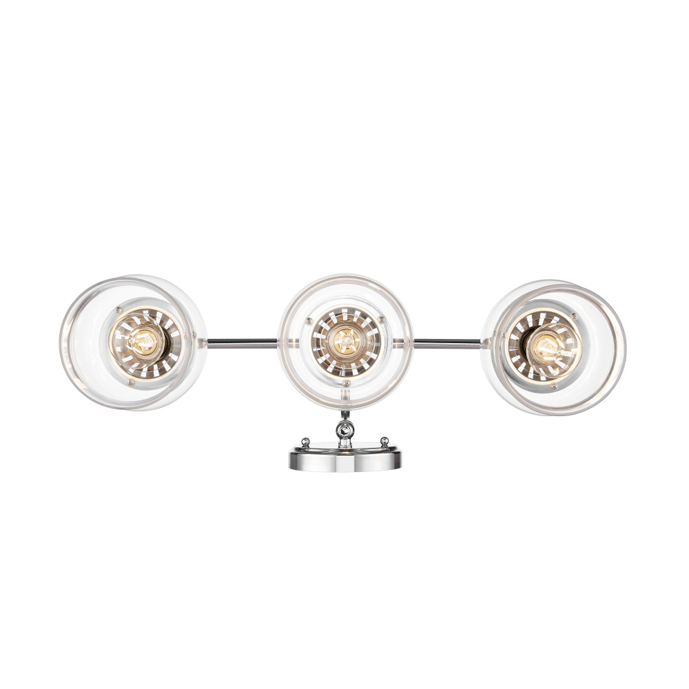 Bring transitional elegance into your home with the Wry Lighting Daphne 3-light Vanity in Chrome. Featuring a glass shade and a polished Chrome frame, it creates a welcoming atmosphere. The clear glass shade offers brilliant, unobstructed light, allowing the beauty of the bulbs to shine through. Its polished Chrome finish provides a stunning high-shine gleam that is both sophisticated and versatile. Suitable for damp locations, this fixture is perfect for bathrooms, covered porches, and laundry rooms. Requires 3 E26 Medium base bulbs (not included) with a maximum wattage of 60 per bulb. Overall dimensions are 24"W x 10.13"H x 8.5"D. Elevate your space with quality and style.