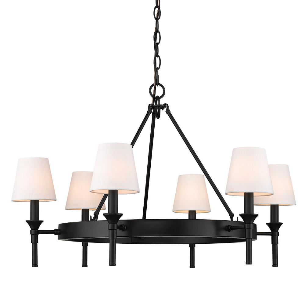 Bring sophistication into your home with the Wry Lighting Edinburgh 6-light Chandelier. Featuring a modern white fabric shade and a Matte Black frame, it creates a stunning lighting effect. The Modern White shade, crafted from high-quality fabric with a fine, linear weave, diffuses light beautifully, creating a bright and inviting atmosphere for various spaces. The Matte Black finish offers a sleek, smooth texture that complements a wide range of decor styles. Ideal for dry locations, this chandelier is a wonderful addition to dining rooms and foyers. Sloped-ceiling compatible and adjustable in height, its installation can be customized to suit your space. Overall Dimensions: 27.25"W x 19.25"H x 27.25"D. Requires 6 E12 Candelabra base bulbs (not included) with a max wattage of 60 per bulb. Enhance your home with the quality and beauty of the Edinburgh chandelier, a true centerpiece for any room.