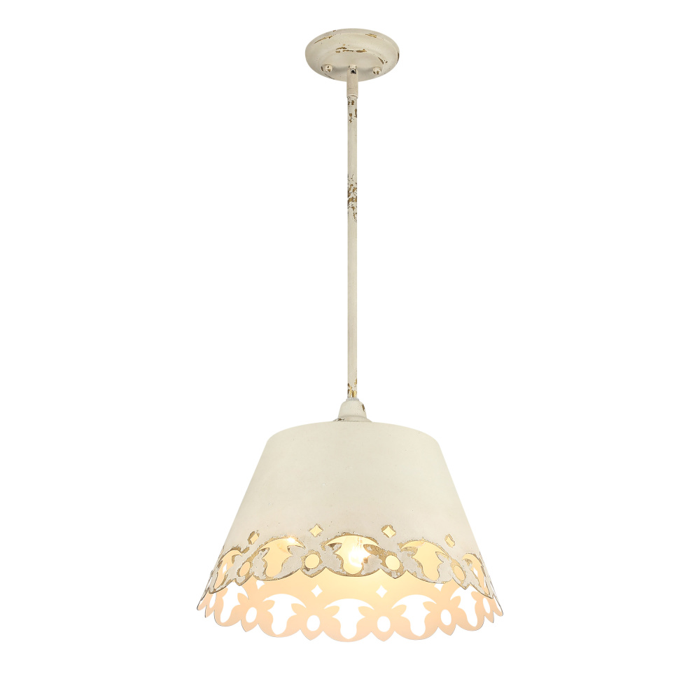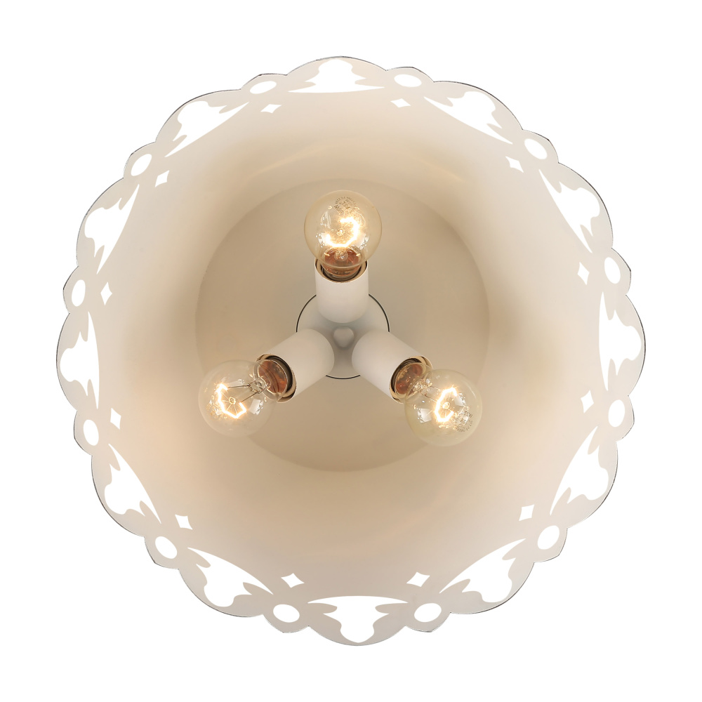 Bring farmhouse elegance into your home with the Wry Lighting Eloise 3-light Pendant in Antique Ivory. Featuring a metal shade and an Antique Ivory frame, it creates a welcoming atmosphere. This metal shade, finished in a creamy, off-white base accentuated by a distressed, cracked texture, allows light to dance beautifully across your space. The finish, artfully aged with a dark patina, enriches the charm by revealing glints of a warm, gilded underlayer, ensuring each piece is unique. Ideal for dry locations, this pendant light is perfect for kitchens, dining rooms, or bedrooms, providing focused yet decorative illumination. Its sloped-ceiling compatibility and adjustable height options (14"-56.125") make installation easy in diverse spaces. Overall Dimensions: 15.38"W x 11.25"H x 15.38"D. Requires 3 E26 Medium base bulbs (not included), with a maximum of 60 watts per bulb. Elevate your home with the timeless craftsmanship and quality of this exquisite lighting fixture.