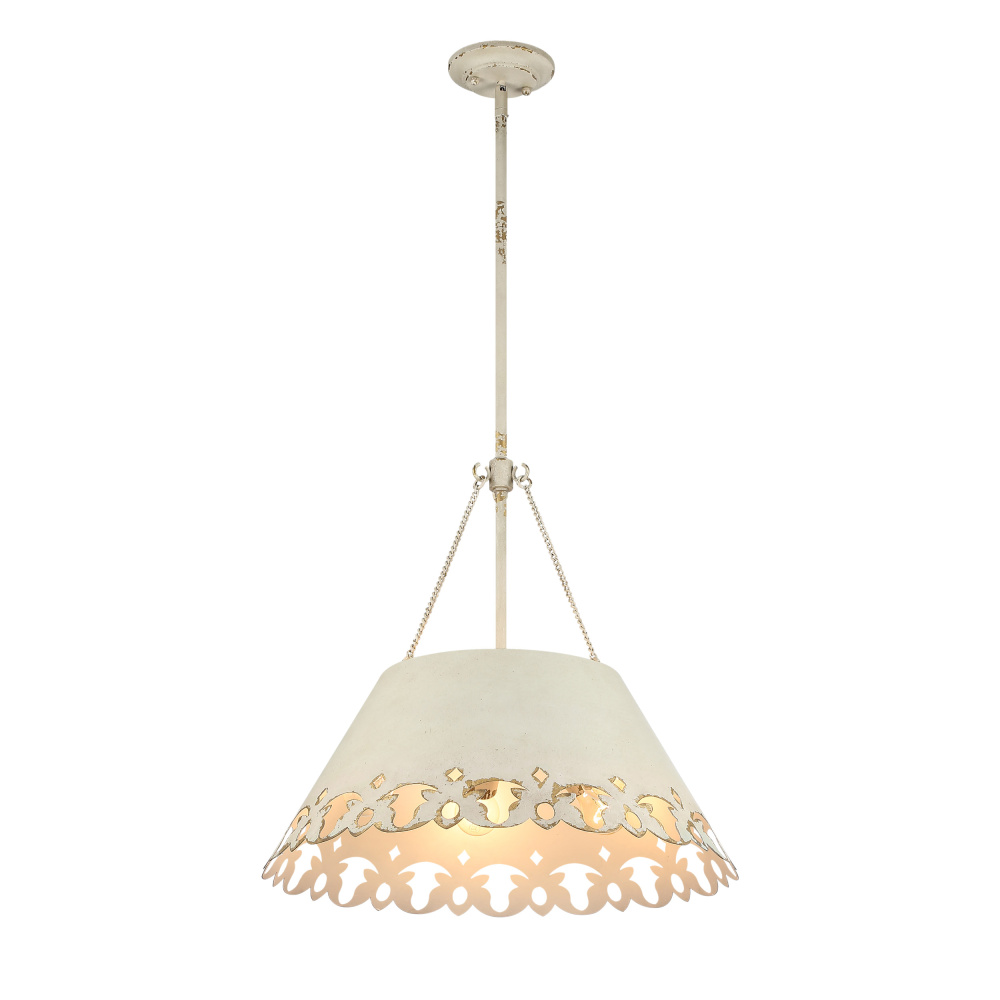 Bring farmhouse elegance into your home with the Wry Lighting Eloise 5-light Pendant in Antique Ivory. Featuring a metal shade and an Antique Ivory frame, it creates a welcoming atmosphere. This metal shade, finished in a creamy, off-white base complemented by a distressed, cracked texture, allows light to shine beautifully throughout your space. Each piece is carefully hand-painted, with subtle variations that highlight its unique character and rich detail, enhancing any decor. Ideal for dry locations, this pendant light is perfect for larger kitchens or dining rooms, providing focused yet decorative illumination. Its sloped-ceiling compatibility and adjustable height options (22.75"-64.75") make installation simple and adaptable to various ceiling styles. Overall Dimensions: 21"W x 20"H x 21"D. Requires 5 E26 Medium base bulbs (not included), with a maximum of 60 watts per bulb. Experience the enchanting charm and quality craftsmanship of this striking fixture, perfect for creating a warm and inviting atmosphere in your home.