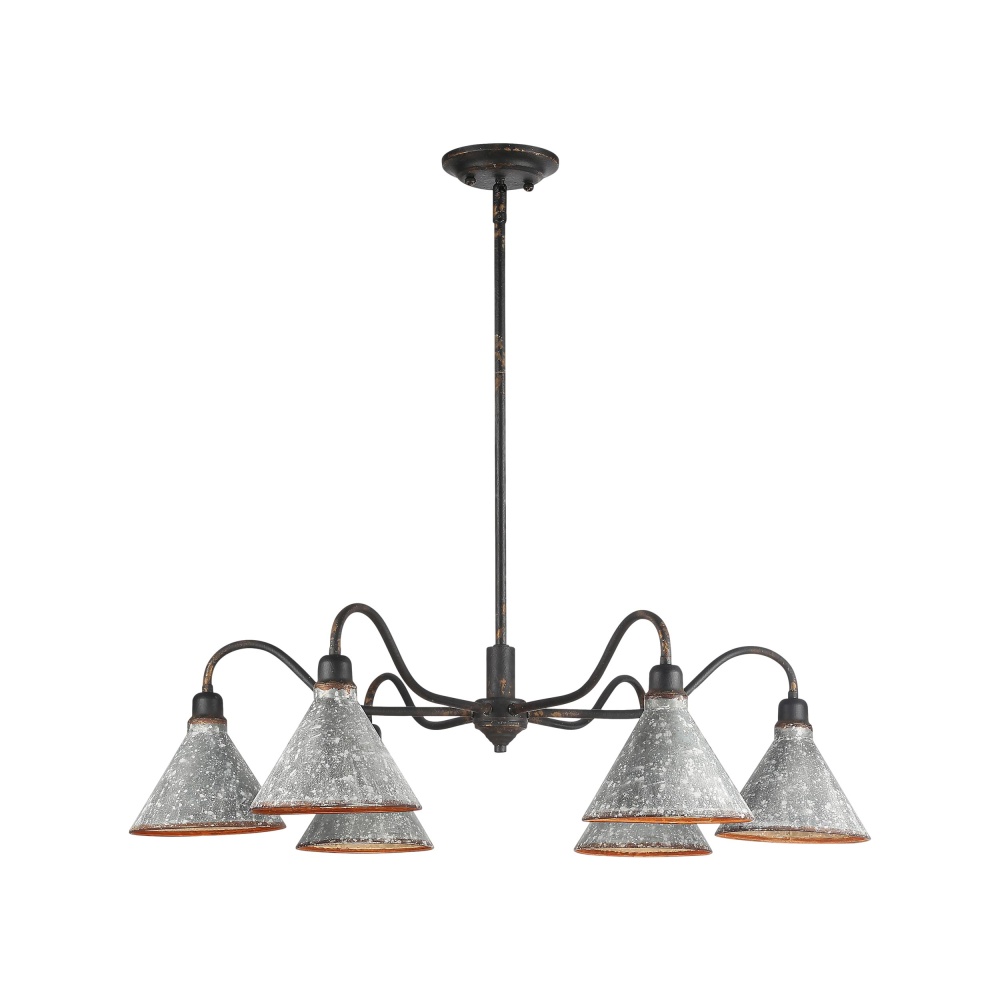 Bring traditional elegance into your home with the Wry Lighting Jasper 6-light Chandelier in Antique Black Iron. Featuring a metal shade and a rustic Antique Black Iron frame, it creates a welcoming atmosphere. This striking metal shade features a heavily textured galvanized steel exterior in mottled gray with chalky white speckles and rust accents, paired with an antiqued golden-orange interior that casts a warm, inviting light. Capture the raw charm of a bygone era with the Antique Black Iron finish, artfully weathered to reveal glimpses of a warm, antiqued gold base beneath. This bold finish enhances any industrial, rustic, or farmhouse decor, making a substantial statement in your space. Ideal for dining rooms, foyers, or living spaces, this chandelier is dry location rated for areas not subject to moisture. With a convertible design, you can easily install it as a semi-flush mount or pendant, with an adjustable height ranging from 12 to 54 inches. Overall Dimensions: 37.88"W x 9.63"H x 37.88"D. Requires 6 E26 Medium base bulbs (not included), max 60 watts per bulb. Each piece is handcrafted, making each chandelier uniquely charming while providing ample illumination for gatherings.