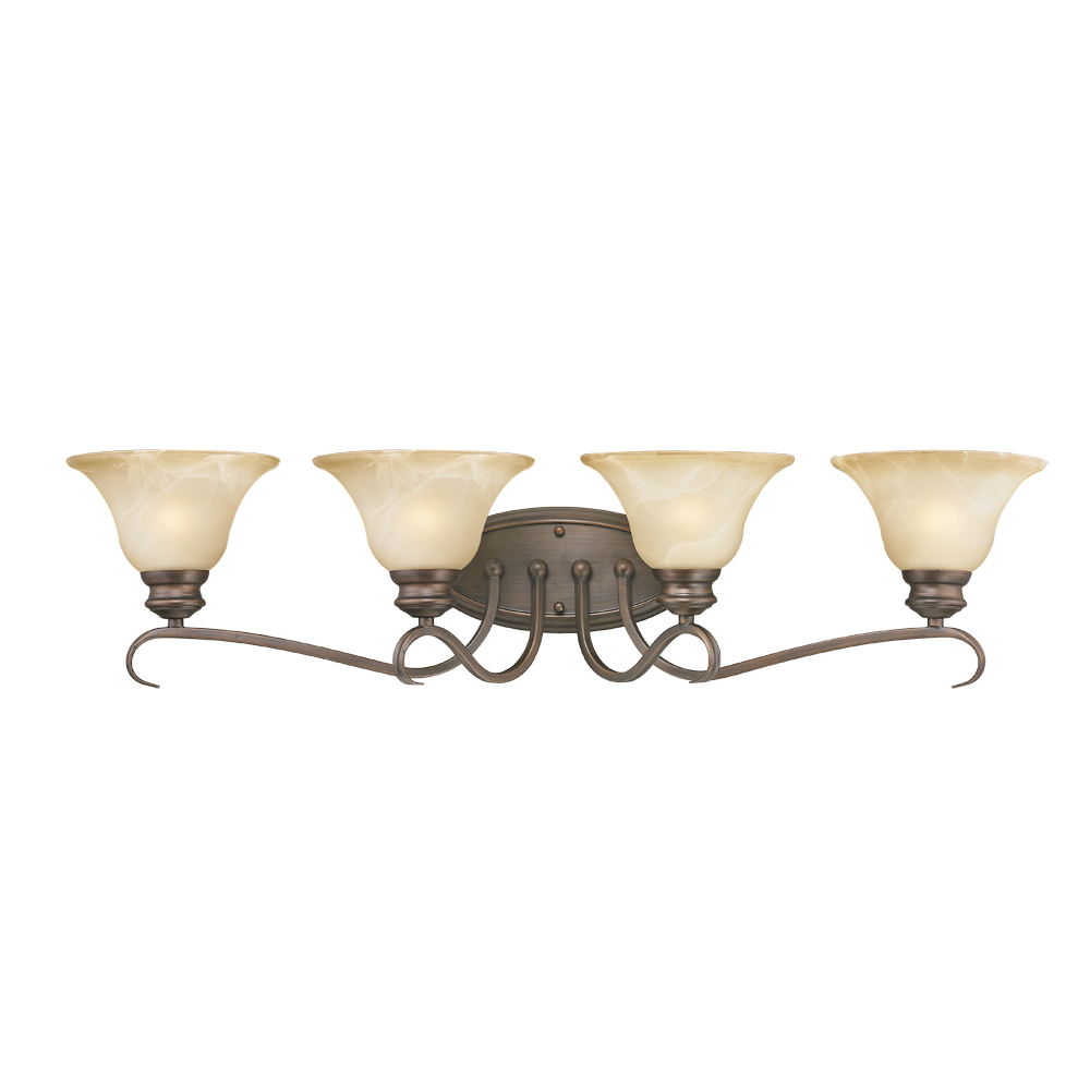 Bring transitional elegance into your home with the Wry Lighting Lancaster 4-light Vanity in Rubbed Bronze. Featuring glass shades and a Rubbed Bronze frame, it creates a welcoming atmosphere while providing practical task illumination. The antique marbled glass shades, inspired by luxurious stone, radiate a soft, warm ambiance that feels both inviting and stately. Our Rubbed Bronze finish enhances the vanity’s classic charm with rich, deep colors and subtle highlights, making it a versatile choice that fits beautifully in various interiors. This vanity light is damp location rated, suitable for covered spaces like bathrooms and laundry rooms. It requires four E26 medium base bulbs (not included, max 100 wattage per bulb) and has overall dimensions of 34"W x 8"H x 8"D. The Wry Lighting Lancaster 4-light Vanity offers quality, style, and a touch of vintage charm for your home.