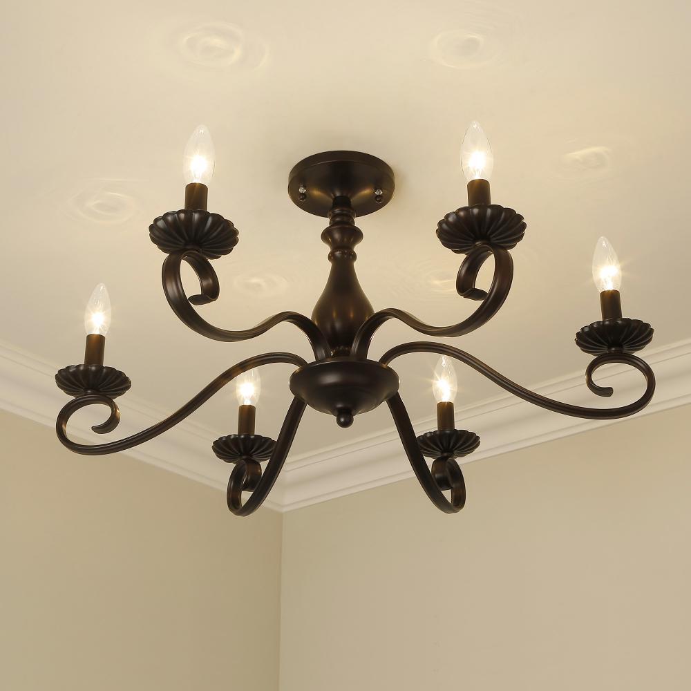 Infuse traditional elegance into your home with the Wry Lighting Larrick 6-light Semi-Flush Mount. This stunning fixture features a rubbed bronze finish that effortlessly blends classic warmth with modern sensibilities. With no shade, this design boasts an open structure that allows for maximum light dispersion, perfect for brightening up your entryway or kitchen. The hand-rubbed surface enhances the deep brown tones with coppery highlights, creating a beautifully inviting glow. Ideal for rooms with mid-height ceilings, this damp location rated fixture fits perfectly in entryways, bedrooms, kitchens, and living areas. The expansive design provides powerful illumination while maintaining ample headspace, making it practical as well as stylish. Overall Dimensions: 26.63"W x 12.88"H x 26.63"D. Requires 6 E12 candelabra base bulbs (not included), max 60 wattage per bulb. Elevate your home decor with this blend of practical design and rich heritage style from Wry Lighting.