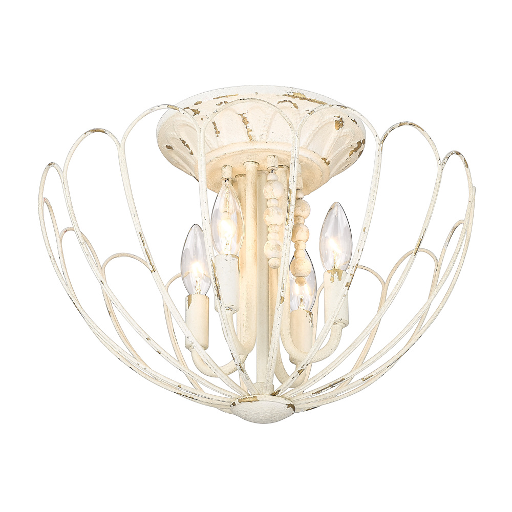 Bring coastal elegance into your home with the Wry Lighting Marguerite 4-light Semi-Flush Mount. Its Vintage Parisian White finish creates a soft, welcoming atmosphere. This fixture features no shade, allowing for an unobstructed light flow that enhances the intricate craftsmanship and vintage charm. With its romantic, distressed finish, it adds to the character of your space. Inspired by the charm of vintage flea market finds, the chipped texture and chalky matte surface evoke the feel of a cherished heirloom. Perfect for blending style and practicality in various settings. Ideal for entryways, bedrooms, kitchens, and living areas with mid-height ceilings, this semi-flush mount is Damp Location Rated, accommodating areas with occasional moisture. Overall Dimensions: 16.13"W x 11.38"H x 16.13"D. Requires 4 E12 Candelabra base bulbs (not included). Max 60 wattage per bulb. Add a touch of romantic and vintage flair to your home decor with this enchanting lighting fixture.