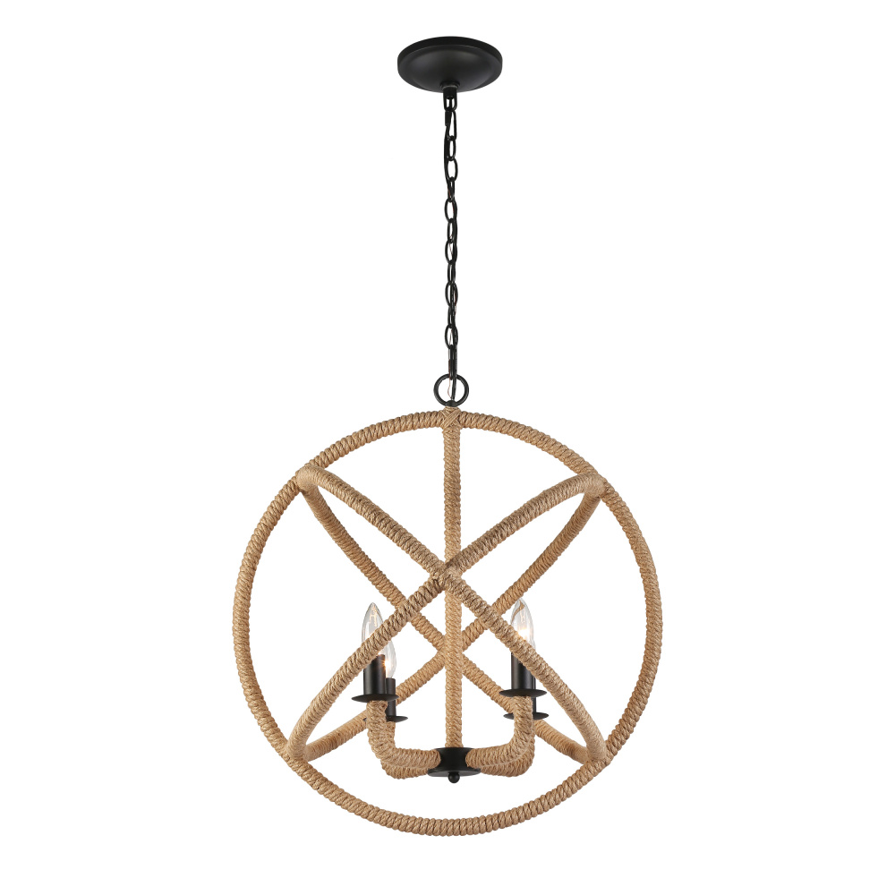 Bring coastal elegance into your home with the Wry Lighting Marina 4-light Chandelier in Natural Black. Featuring a frame with a beautiful Natural Black finish, it creates a welcoming atmosphere. This chandelier boasts no shade, allowing the light to flow freely and brighten your space. The authentic rope accents add an organic touch, enhancing the textural experience. The Natural Black finish offers a softer, organic take with its gentle, slightly faded look and chalky, non-reflective matte surface. This design complements various styles from modern farmhouse to industrial. Perfect for dining rooms and living spaces, this chandelier is dry location rated, making it ideal for indoor spaces not subject to moisture. It's compatible with sloped ceilings and features an adjustable height from 28.125" to 99.125", allowing for a customized fit. Overall Dimensions: 23" W x 25.5" H x 23" D. Requires 4 E12 candelabra base bulbs (not included), max 60 wattage per bulb. Elevate your interior with this stunning chandelier, a versatile piece that brings sophistication to any setting.