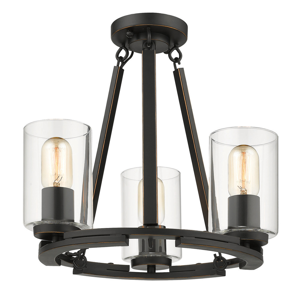 Bring modern sophistication into your home with the Wry Lighting Monroe 3-light Semi-Flush in Matte Black. Featuring a glass shade and a matte black finish, it offers a welcoming glow. The clear glass shade provides unobstructed light, allowing your space to shine. The timeless matte black finish complements a wide range of decor styles, making this fixture an ideal choice for any room. It is dry location rated for indoor spaces, and its convertible design allows for easy installation as either a semi-flush mount or a pendant, with sloped ceiling compatibility. The fixture overall dimensions are 16"W x 16.13"H x 16"D and requires 3 E26 medium base bulbs (not included), with a maximum of 60 watts per bulb. Perfect for adding practicality and style to any space.