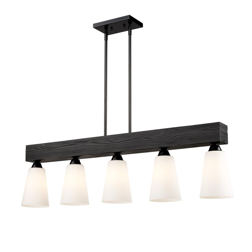 Bring modern sophistication into your home with the Wry Lighting Neela 5-light Island Light in Matte Black. Featuring opal glass shades and a matte black frame, it creates a welcoming atmosphere. Each opal glass shade is designed to diffuse light evenly for a soft, glare-free glow, providing a timeless and elegant ambiance. The matte black finish is both versatile and smooth to the touch, complementing various decor styles from minimalist to bold contemporary. Tailored for kitchen islands, this elegant fixture is dry location rated, making it ideal for indoor spaces such as living rooms and hallways. The light is sloped-ceiling compatible and has an adjustable height of 14.375" to 56.375", ensuring a perfect fit for your space. Overall dimensions are 41.63"W x 11.75"H x 5.38"D, and it requires 5 E26 medium base bulbs (not included), with a maximum wattage of 60 per bulb. Elevate your kitchen with this blend of style and quality, making a striking statement in your home.