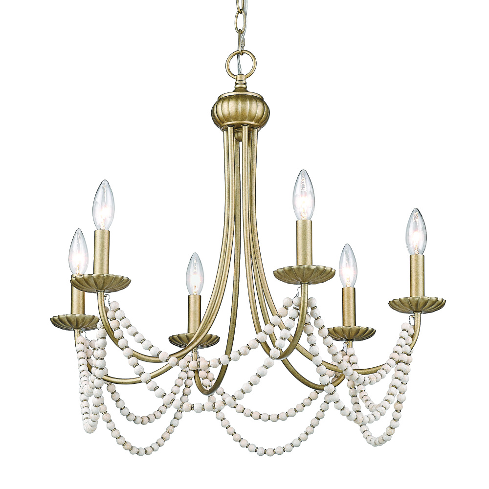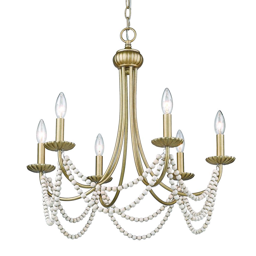 Bring transitional elegance into your home with the Wry Lighting Serafina 6-light Chandelier. Crafted without a shade, it showcases a warm glow that enhances your decor. The chandelier features a rustic, elegant design with a stunning Golden Aura finish, exuding old-world charm while providing a cozy and inviting ambiance. Its unique finish resembles antique Gesso, offering a soft, chalky look that is both tactile and visually appealing. This chandelier is perfect for dining rooms, living spaces, and entries. It is dry location rated, making it ideal for indoor use in settings that are not exposed to moisture. The fixture is compatible with sloped ceilings and has an adjustable height ranging from 28 inches to 97.375 inches, allowing you to customize it to fit your space perfectly. With overall dimensions of 24.5"W x 23.75"H x 24.5"D, this chandelier requires six E12 candelabra base bulbs (not included) with a max wattage of 60 per bulb, ensuring ample illumination for any occasion. Elevate your home with this luxurious yet relaxed fixture that beautifully complements various decor styles.