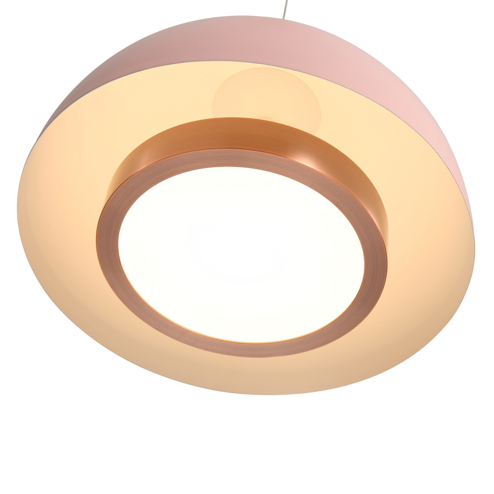 Bring modern elegance into your home with the Wry Lighting Solsken Integrated LED Pendant in Dusty Rose. Featuring a metal shade and a Dusty Rose frame, it creates a welcoming atmosphere. The metal shade enhances the light with an Aged Copper accent that beautifully captures and diffuses light, creating a cozy ambiance. This elegant accent glows with a rich luster, catching the eye and enriching your space. The sophisticated Dusty Rose finish offers a modern take with its soft, muted blush tones that feature earthy undertones, offering warmth and a touch of understated elegance. Perfect for kitchens, dining rooms, and bedrooms, this fixture is Damp Location Rated, making it suitable for covered and semi-enclosed spaces like bathrooms and porches. It is also Sloped-Ceiling Compatible and features an Adjustable Height ranging from 17" to 120". Overall Dimensions: 11.75"W x 7.5"H x 11.75"D. Integrated LED technology provides 688 rated lumens at a warm 3000K CCT, ensuring brilliant, energy-efficient illumination. Elevate your space with the quality and stylish appeal of this fixture from Wry Lighting.