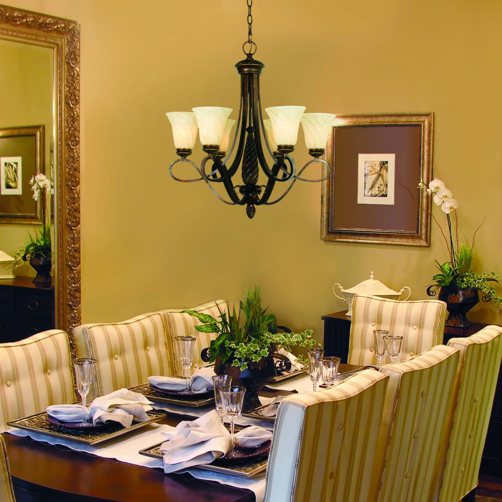 Bring traditional elegance into your home with the Wry Lighting Torbellino 6-light Chandelier in Cordoban Bronze. Featuring a glass shade and a Cordoban Bronze frame, it creates a welcoming atmosphere. The glass shade showcases exquisite Remolino glass, which features a dynamic swirling texture that creates beautiful light play and a soft, warm ambiance. Capture the beauty of elegant motion with this unique finish, allowing graceful, swirling ribs to wrap around the shade, creating a dynamic sense of movement. The soft, satin finish of the warm, creamy glass beautifully diffuses light, casting an inviting glow while minimizing glare. Inspired by the rich, hand-rubbed leathers of old-world Spain, the Cordoban Bronze finish exudes warmth and artisan character. This timeless choice adds a touch of classic sophistication and warmth to any indoor setting. Make a grand impression in dining rooms and foyers, or elevate your bedrooms and living spaces. This chandelier is dry location rated, ideal for indoor spaces. Its sloped-ceiling compatibility and adjustable height (Min: 30"- Max: 102") make installation easy and customizable. Overall dimensions are 27.5"W x 28.5"H x 27.5"D, and it requires 6 E26 Medium base bulbs (not included) with a maximum wattage of 60 per bulb. Enjoy the elegant craftsmanship and timeless charm that this chandelier brings to your home.